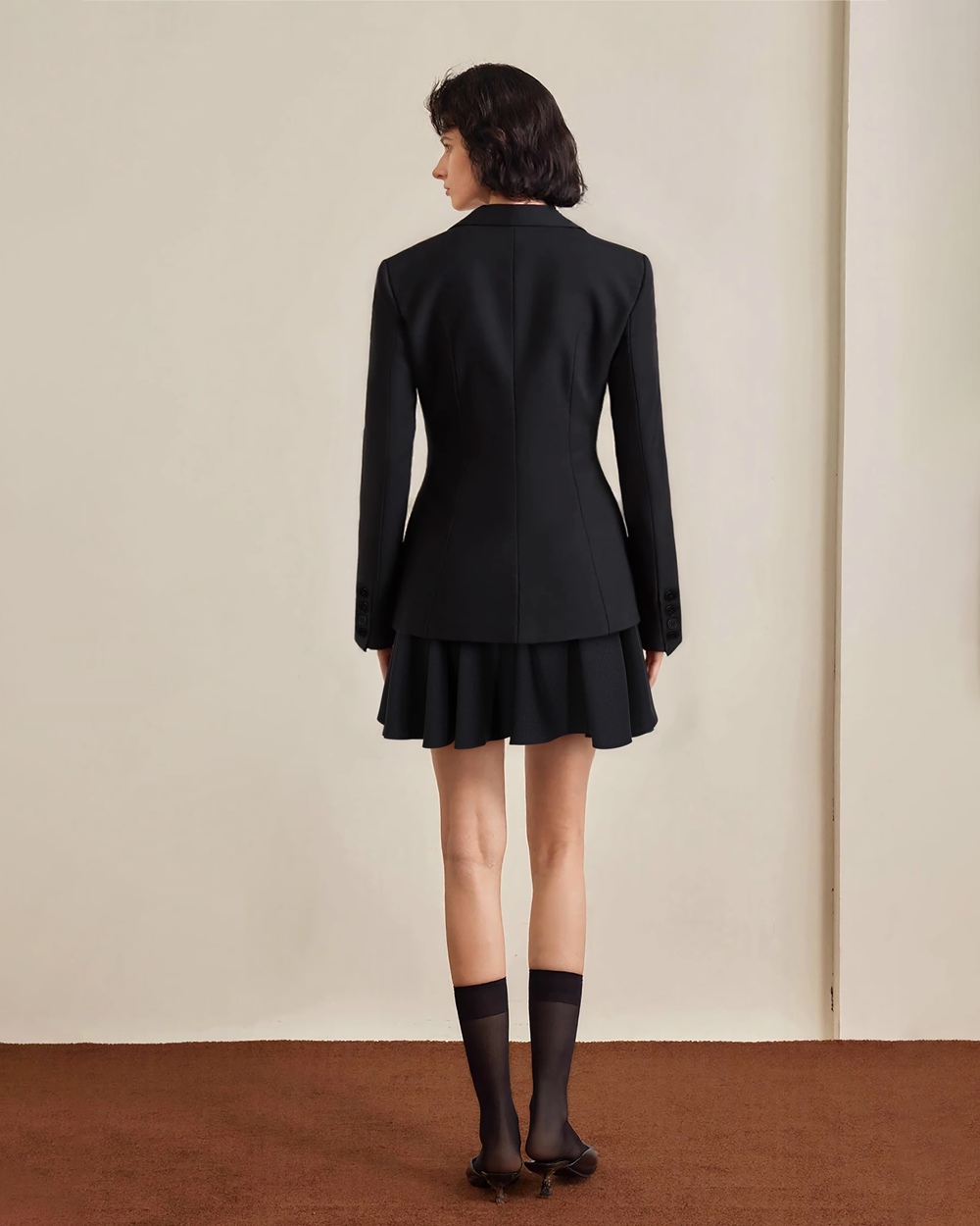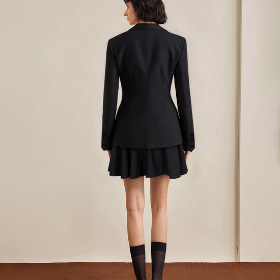 Tailored blazer with defined waist and flared mini skirt. Choose your regular size for a refined, structured fit; size up for added layering comfort.