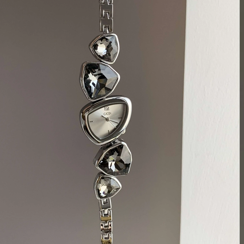 Presentando el Reloj de cristal negroUna fusión de elegancia y diseño vanguardista. Con una impactante esfera de cristal negro y un diseño irregular y poco convencional, este reloj incorpora un distintivo brazalete de eslabones que le aporta un toque de sofisticación. El preciso movimiento de cuarzo garantiza una precisión horaria, mientras que su audaz diseño lo distingue del resto. Perfecto para quienes buscan la moda, este reloj irradia un encanto vanguardista, ideal tanto para ocasiones informales como para la noche.