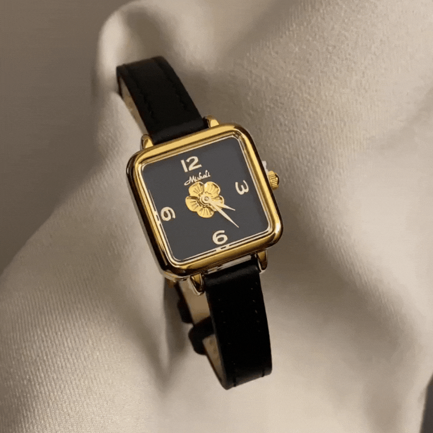Elegancia vintage: cuero negro y cajón de oro Camellia Dial Quartz Watch