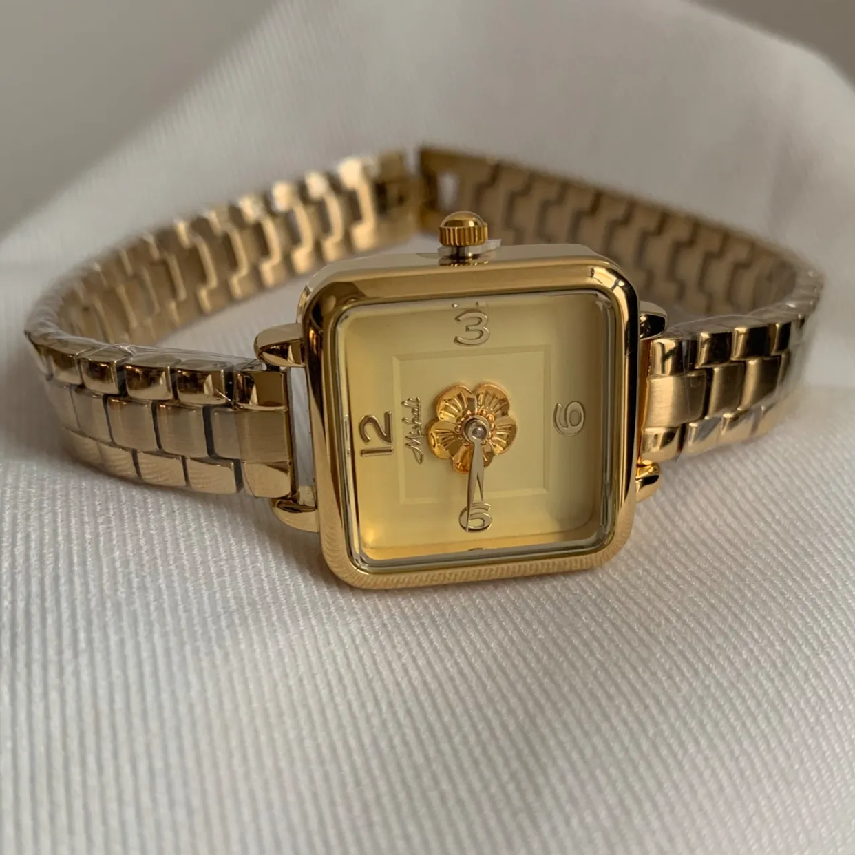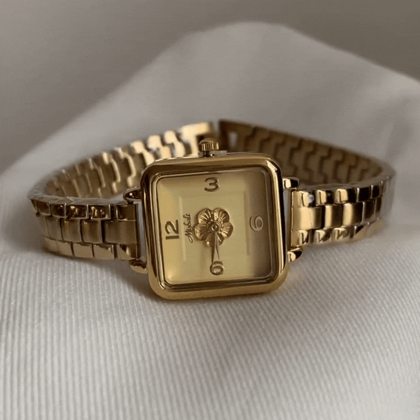 Presentamos el Reloj Camellia Dorada, una impresionante fusión de lujo y elegancia. Con un radiante brazalete dorado y elaborados detalles de camelia inspirados en el bambú, este exquisito reloj se define por su elegante caja cuadrada y su refinado diseño. La esfera minimalista, enmarcada por una delicada estructura, encarna una sofisticación atemporal, convirtiéndolo en el accesorio perfecto para cualquier ocasión.