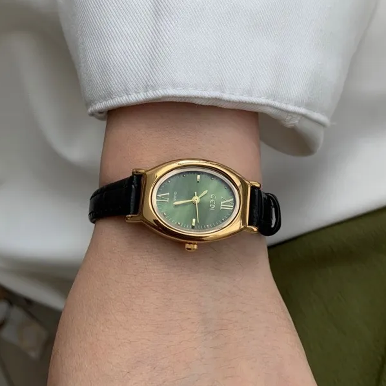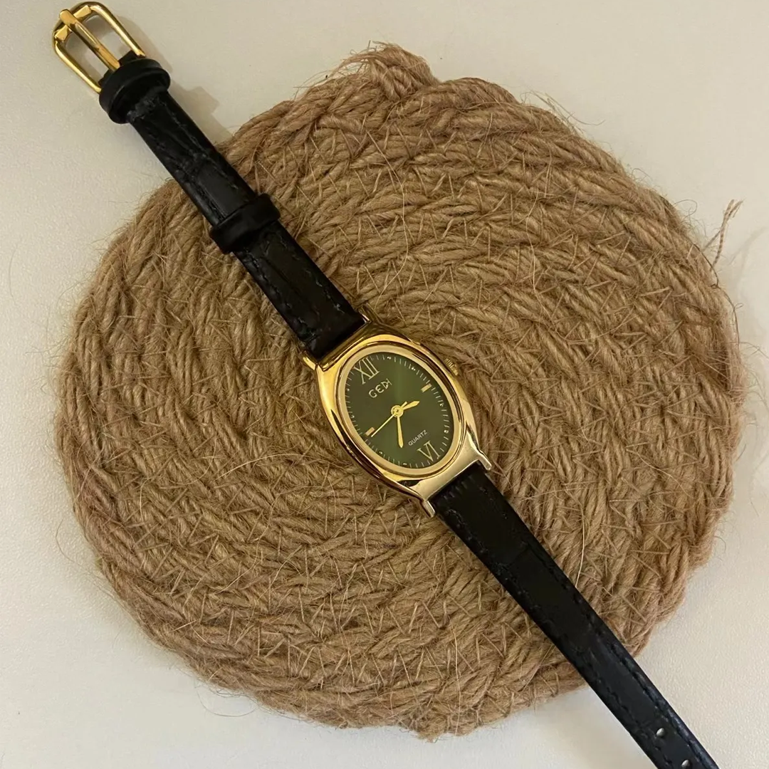 Con una esfera verde ovalada enmarcada en un marco dorado y una elegante correa de piel auténtica negra, este reloj combina la sofisticación vintage con un estilo moderno. Perfecto para cualquier ocasión.