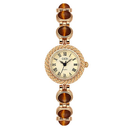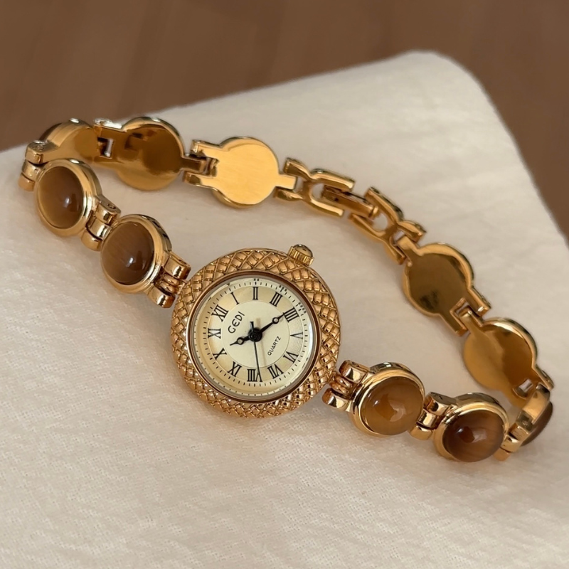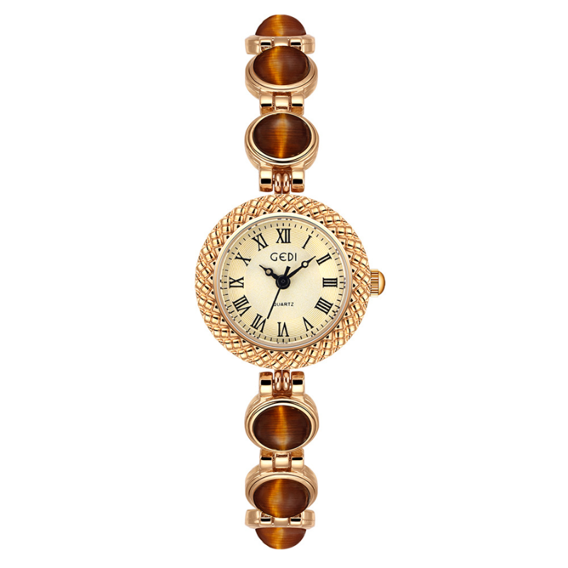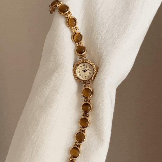 The Gemstone Grace Watch evokes vintage sophistication through its brown stone inlay and gold bracelet design. The round dial adds a soft, timeless touch, while the gemstone accents create a warm, luxurious glow. Designed for women who appreciate refined details and classic charm, this watch doubles as an elegant jewelry piece for any occasion.