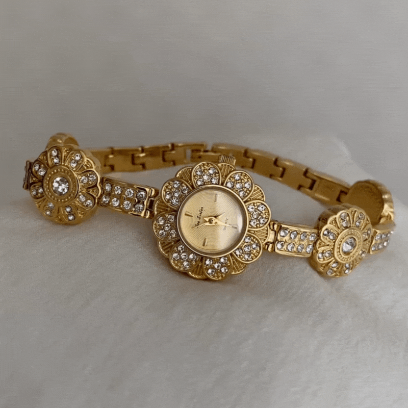 Adorn your wrist with timeless elegance through our vintage floral watch, where classic design meets refined artistry. It features a radiant gold dial set in a floral-inspired gold frame adorned with sparkling crystals, paired with a matching alloy bracelet for harmonious sophistication.