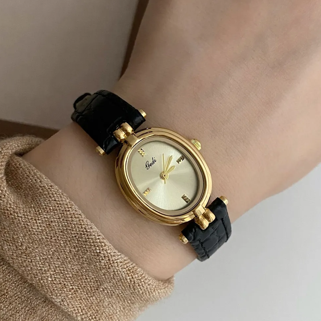 Reloj de cuarzo de inspiración francesa vintage para mujeres-Dial ovalada dorada y correa de cuero negro