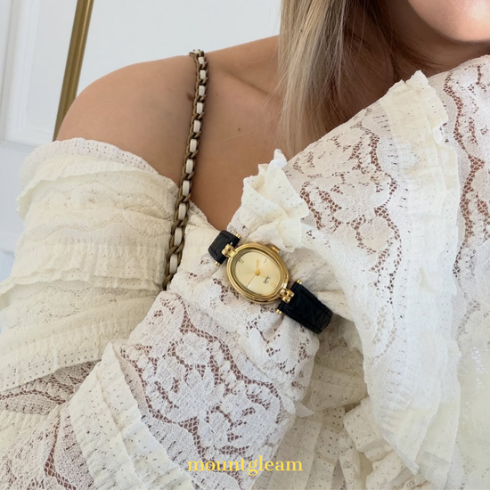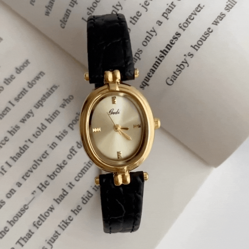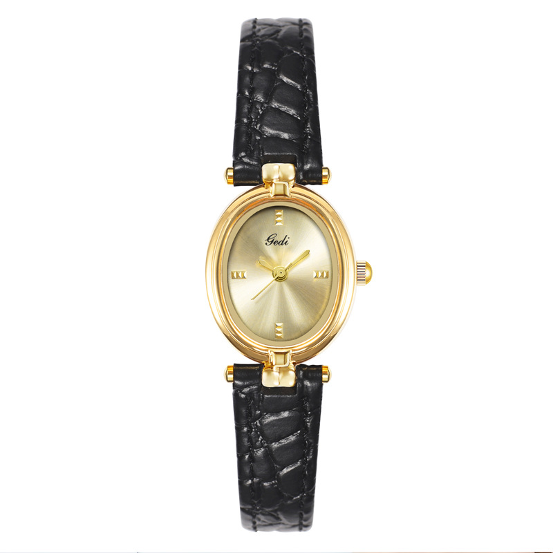 Este elegante reloj de cuarzo de estilo vintage cuenta con una esfera ovalada de oro refinado, emparejado con un elegante correa de cuero negro, que rezuma un encanto clásico de inspiración francesa. Con movimiento de cuarzo preciso y un estética retro atemporalEs el accesorio perfecto para quienes aprecian la sofisticación discreta y la elegancia vintage.