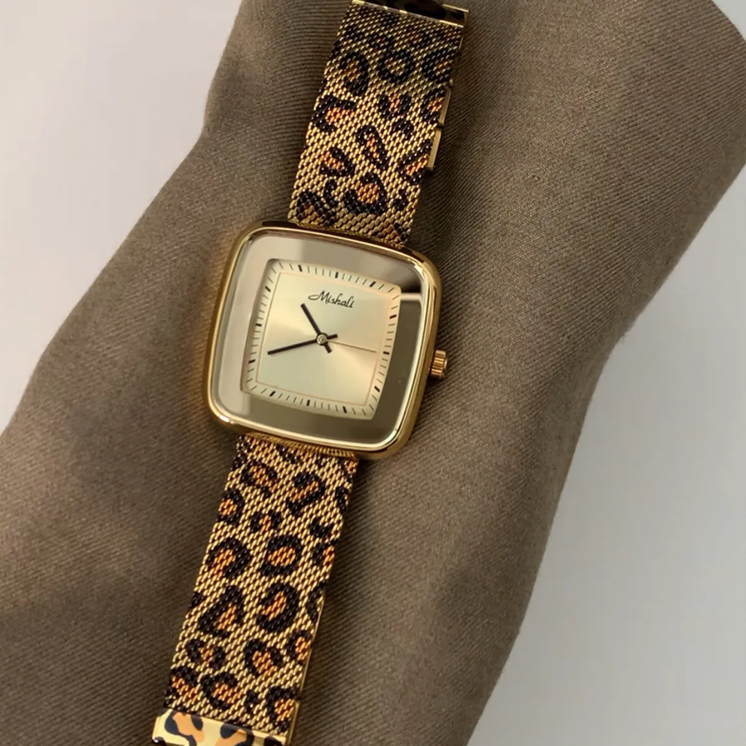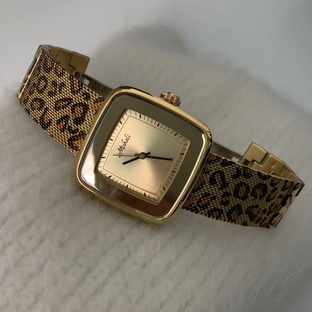 Este llamativo reloj de cuarzo luce una atrevida correa ancha con estampado de leopardo y una lujosa esfera cuadrada dorada. Su diseño de inspiración vintage irradia sofisticación y seguridad, perfecto para mujeres a la moda.
