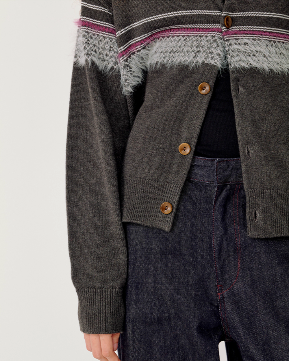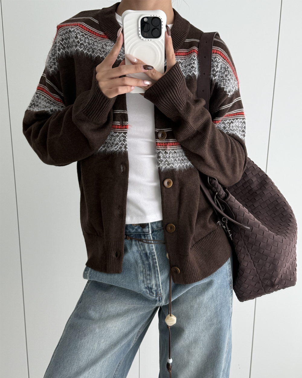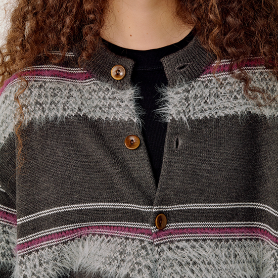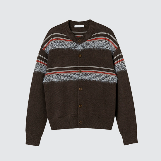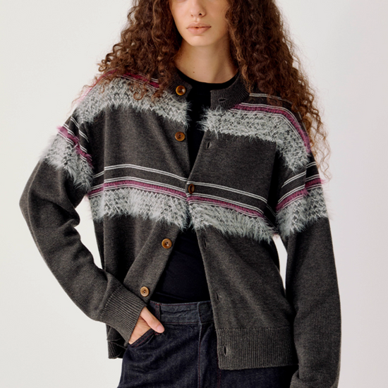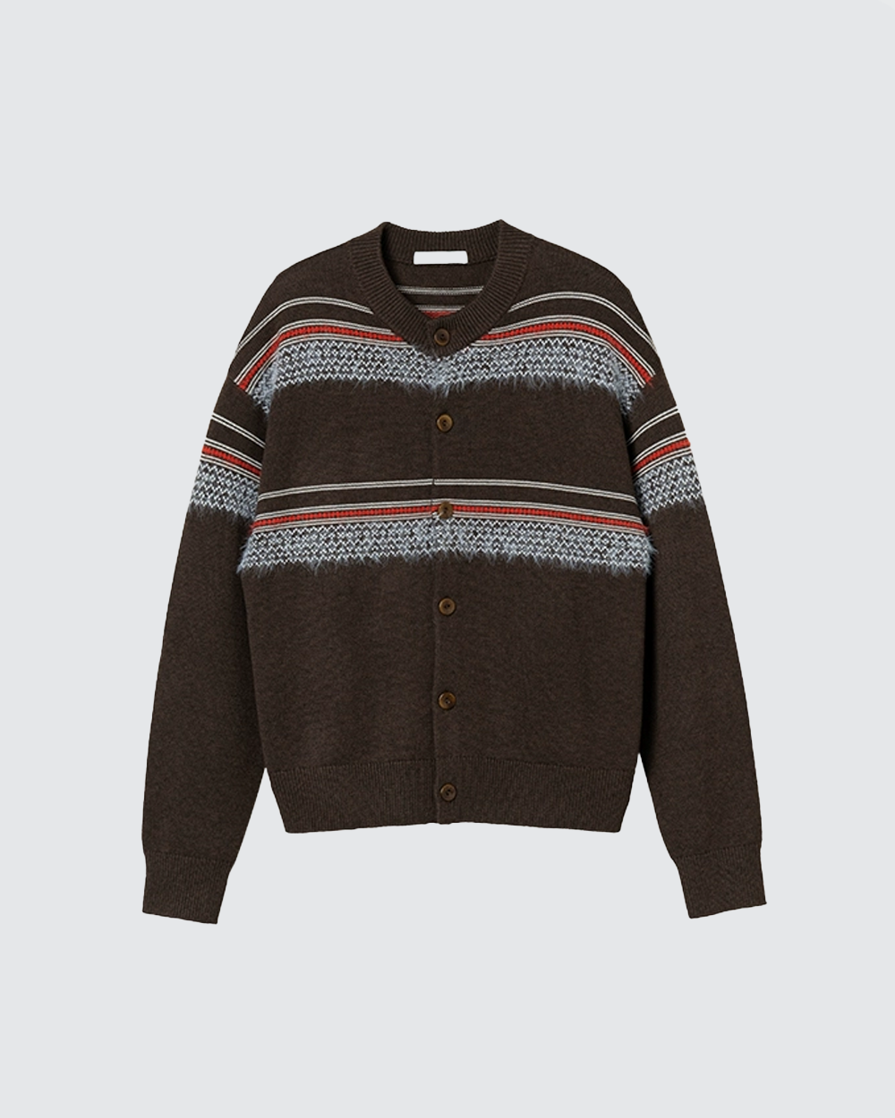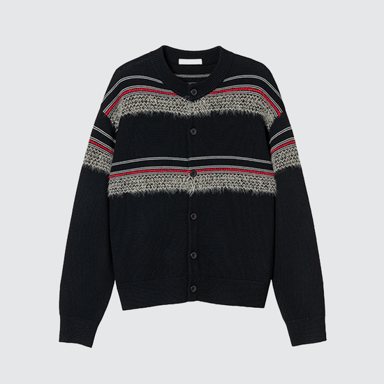 - Design Elements: Retro stripe pattern, button-down front, ribbed cuffs and hem