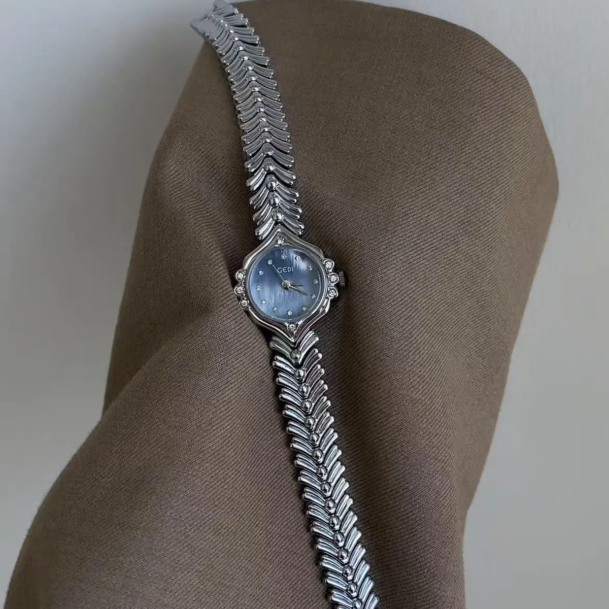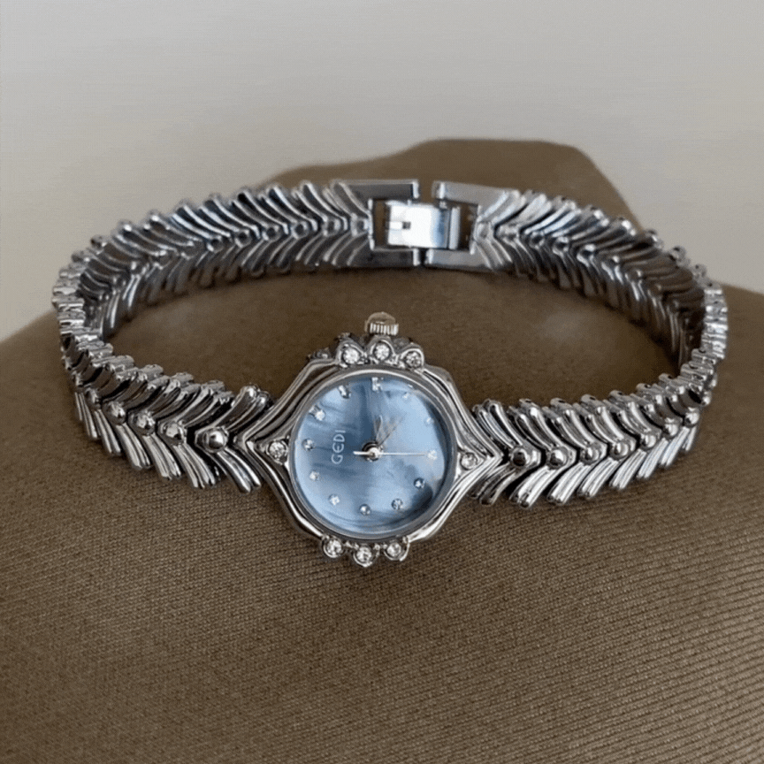 Este elegante reloj de cuarzo cuenta con una Esfera de nácar azul brillante adornado con acentos de cristal brillante, emparejado con un Correa de estilo vintage delicadamente elaborada inspirada en colas de sirena.. Con su silueta refinada y encanto oceánico de ensueño, es una mezcla perfecta de feminidad y diseño atemporal.