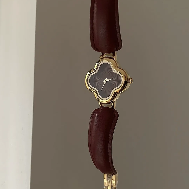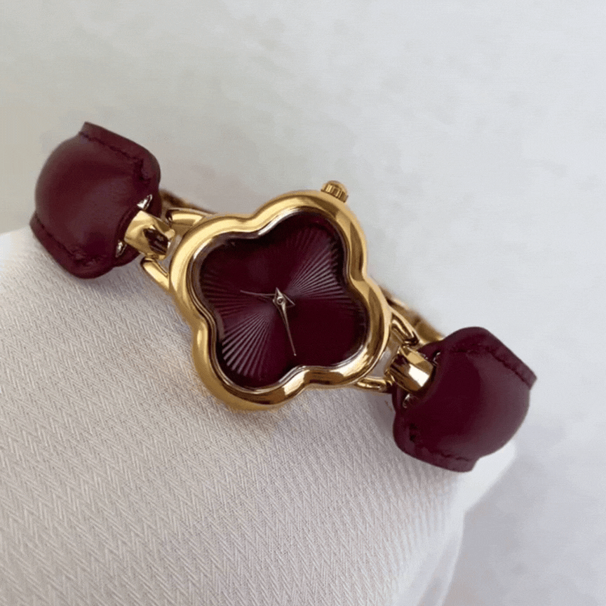 Montre à quartz en cuir avec breloque trèfle rouge angora