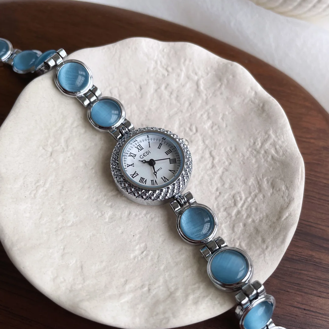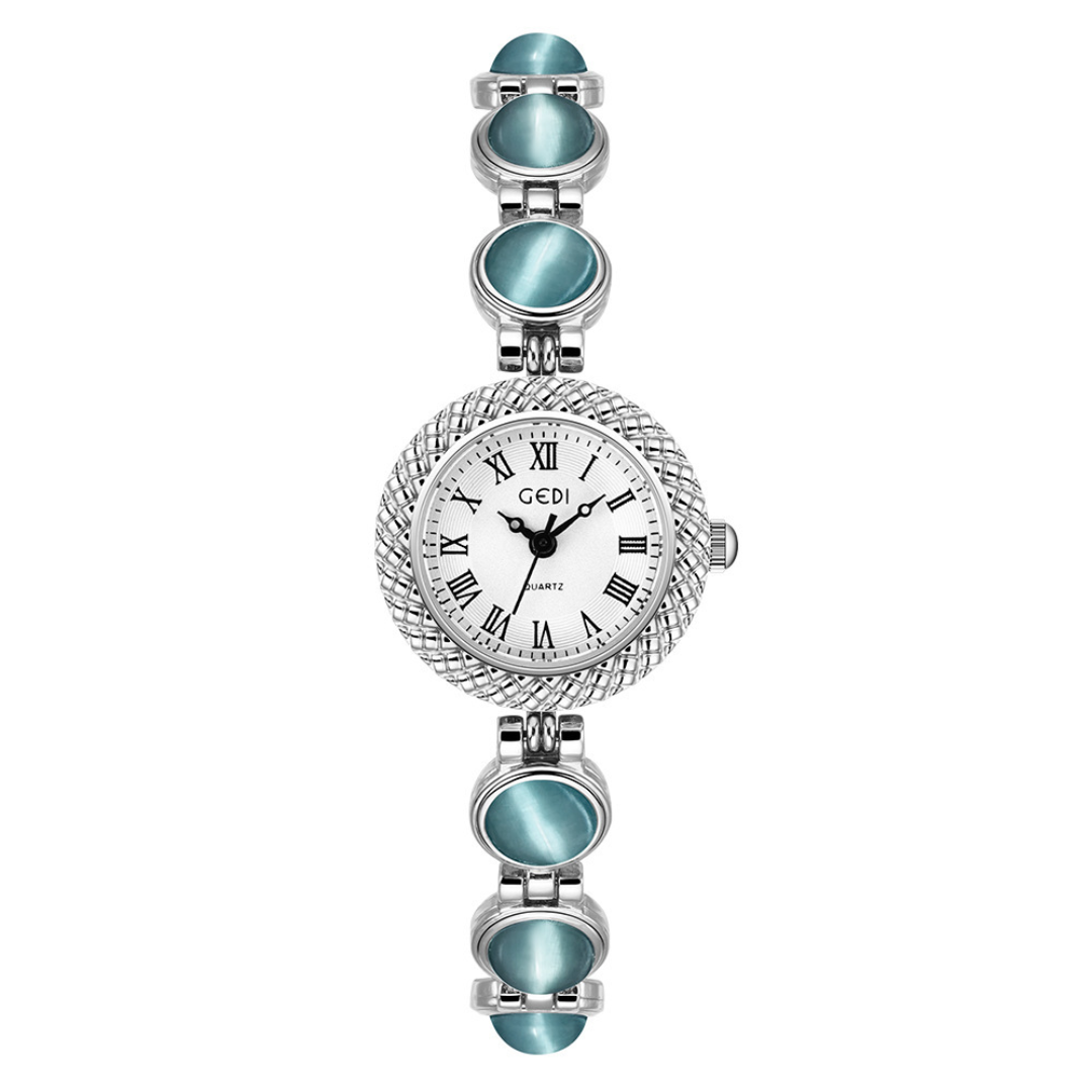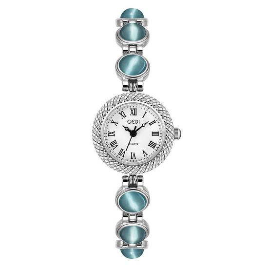 Montre à quartz pour femme avec bracelet incrusté de pierres œil de chat bleu aqua