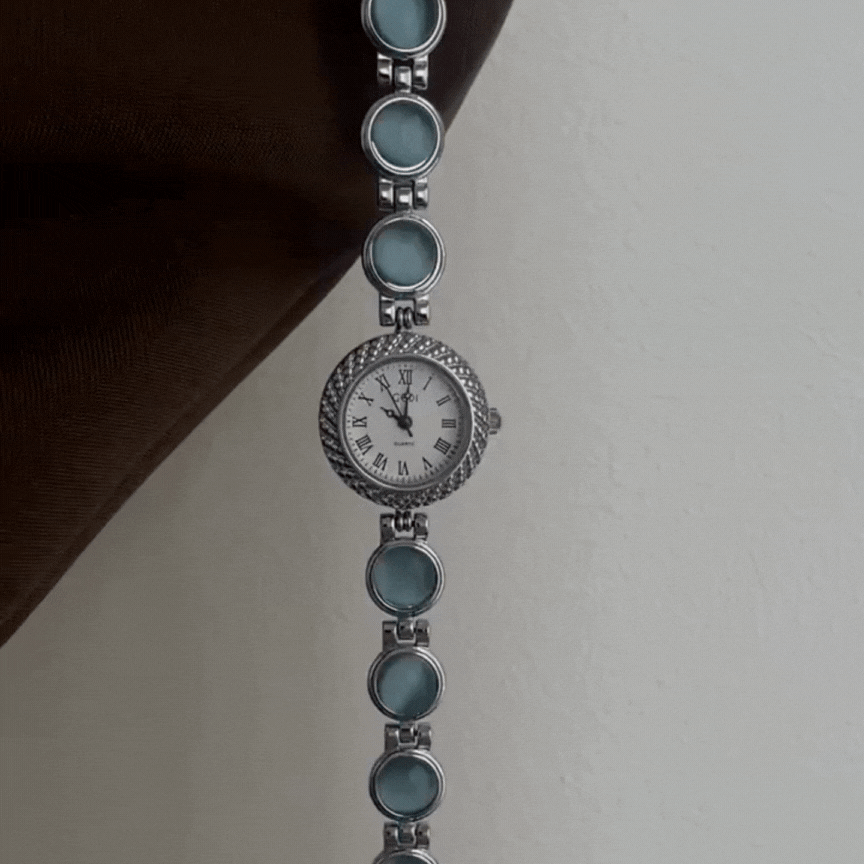 Cette élégante montre à quartz arbore un cadran bleu aqua transparent orné d'une pierre œil-de-chat , rehaussé d'un élégant bracelet . Avec son éclat de pierre précieuse et son design délicat , c'est une pièce raffinée qui allie beauté naturelle et charme intemporel.