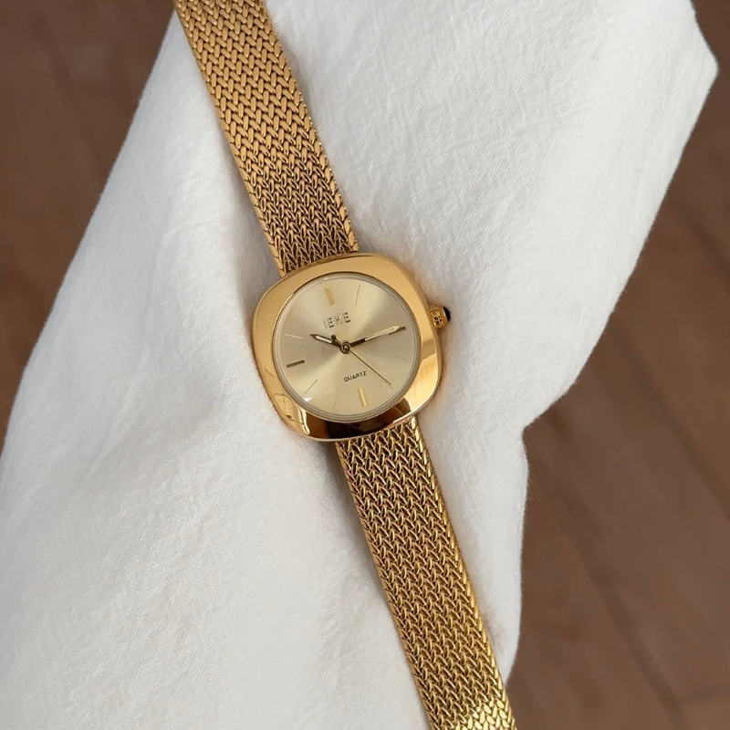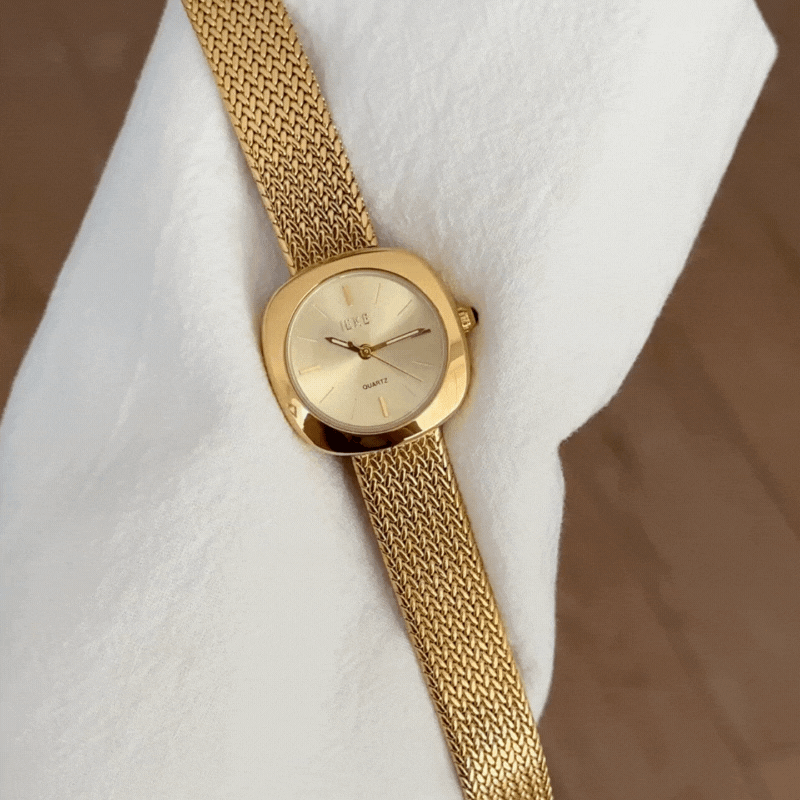 The Aurora Grain watch is the embodiment of timeless elegance and modern simplicity. Featuring a refined gold wheat-link bracelet and a sleek square dial, it perfectly balances sophistication and minimalism. The intricate bracelet texture catches the light beautifully, making this piece as much a jewelry statement as it is a reliable timepiece. Whether paired with office attire or an evening dress, it adds an effortlessly polished touch.