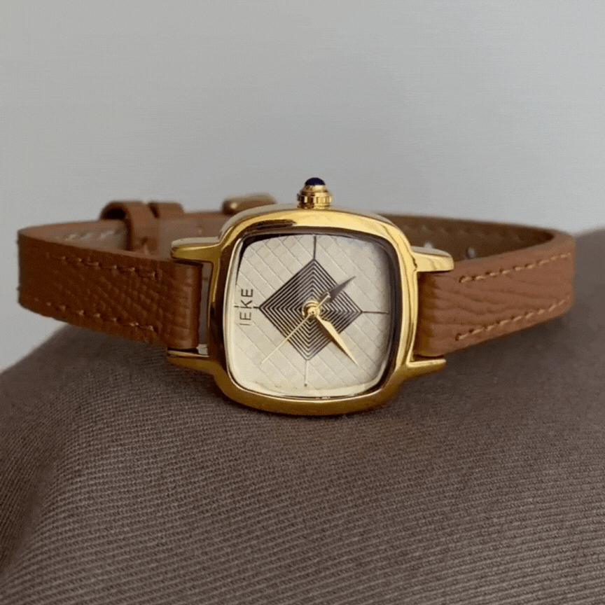 Elegant women’s quartz watch with a slim brown genuine leather strap, gold square case, and geometric dial, offering light luxury and refined style.