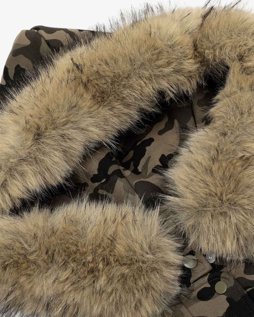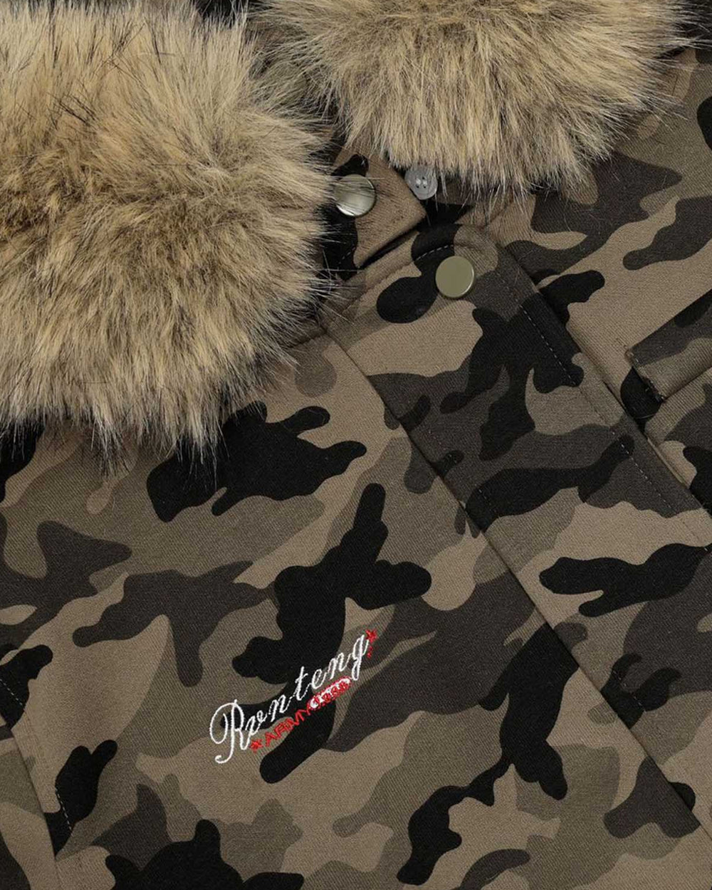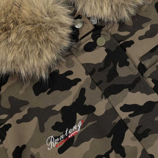- Design Elements: Military camouflage print, detachable faux fur collar, ribbed cuffs and hem, front patch pockets, and embroidered logo patch