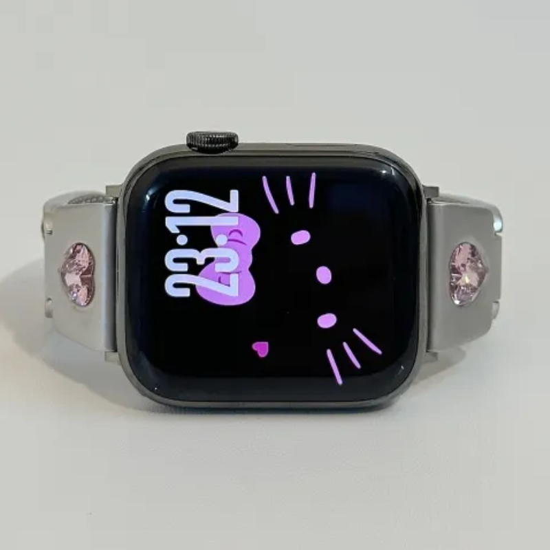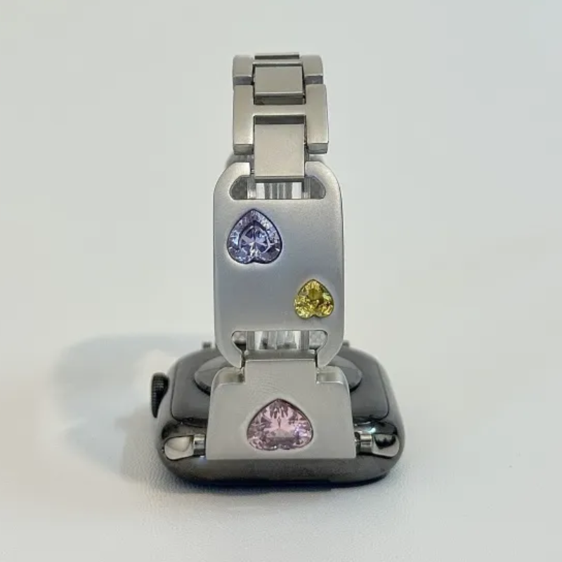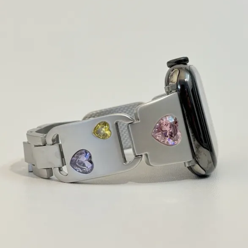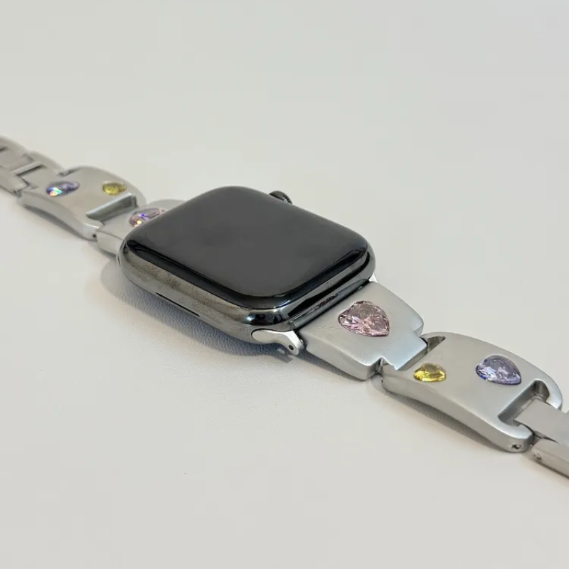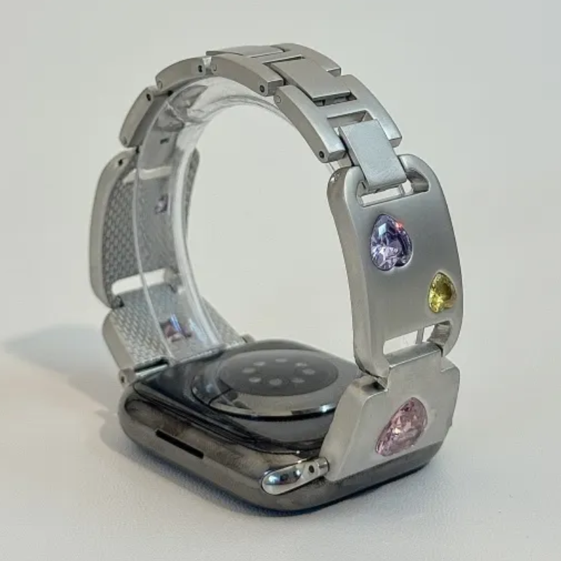 Conçu pour l'Apple Watch, ce bracelet en acier inoxydable arbore des maillons en forme de cœur incrustés de cristaux colorés , offrant un éclat ludique et lumineux sous tous les angles. À la fois bijou et bracelet de montre, il est parfait pour sublimer vos appareils technologiques du quotidien.