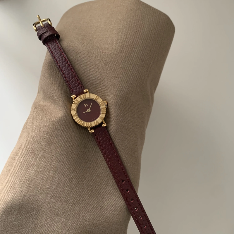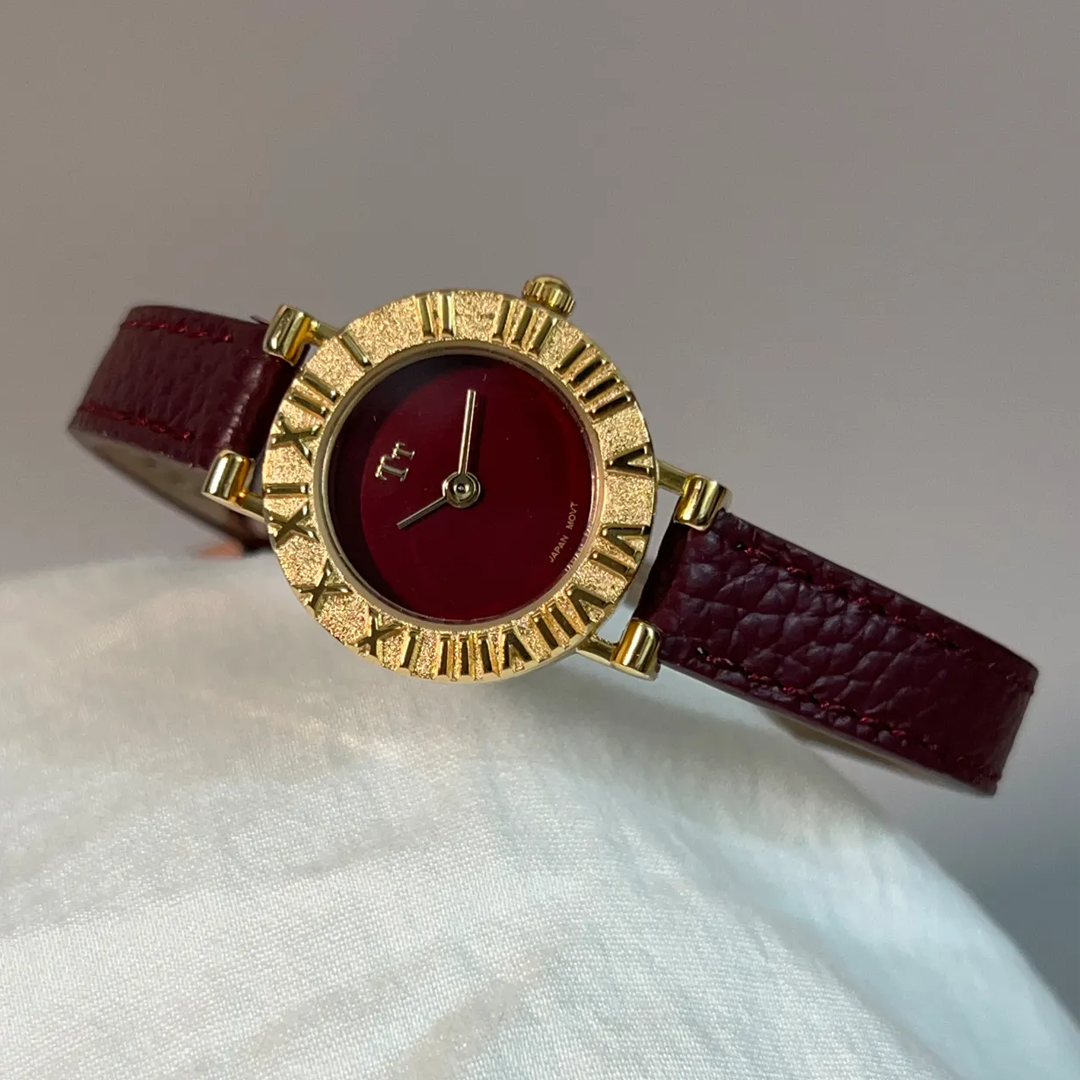 Découvrez la montre Crimson Charm, une fusion saisissante de style audacieux et d'élégance raffinée. Son bracelet en cuir rouge intense s'associe à un boîtier asymétrique doré, tandis que son cadran rouge cramoisi avec chiffres romains et aiguilles dorées évoque une sophistication intemporelle.