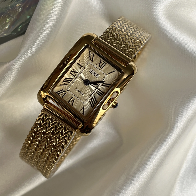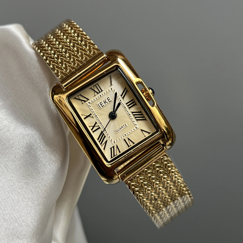 Montre femme polyvalente à cadran carré doré – Chiffres romains et bracelet à motif blé pour une élégance au quotidien