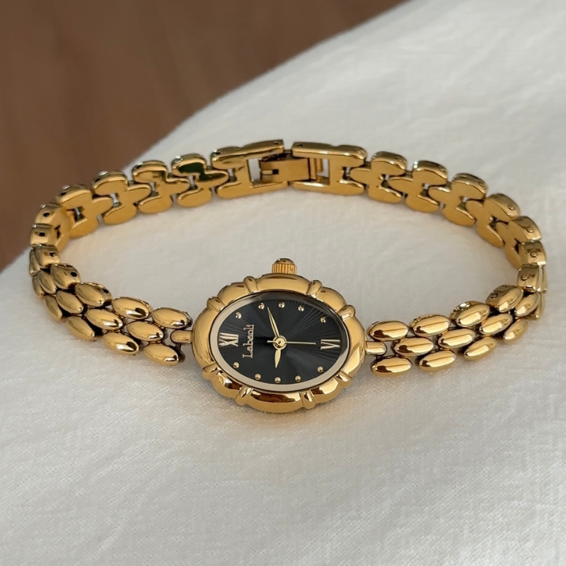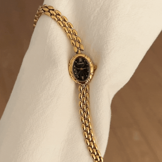 Élise Noir – Elegant Gold Bracelet Women’s Quartz Watch with Black Oval Dial
