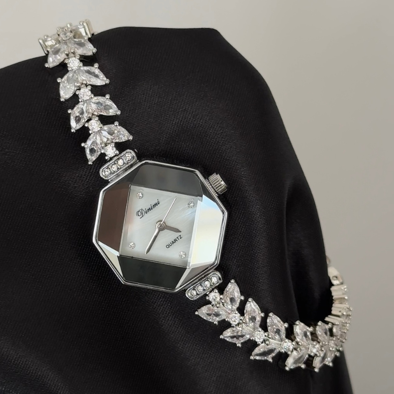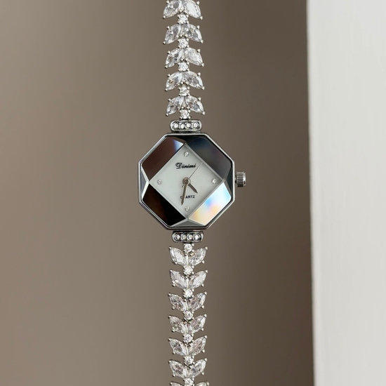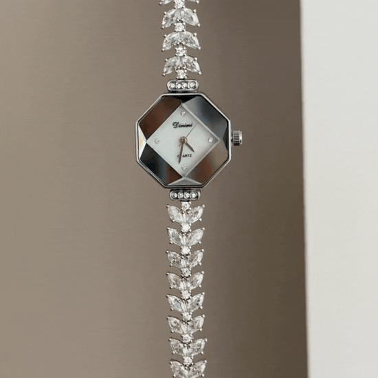 Ethereal Elegance White Diamond Dial Watch - Silver Mermaid Tail Crystal Bracezlet