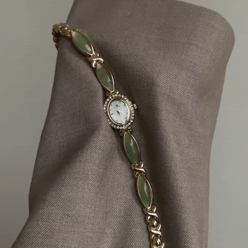 Élégamment conçue avec un cadran ovale lisse, cette montre à quartz est ornée d'une superbe incrustation de calcédoine verte et d'un bracelet délicat. Une fusion parfaite entre sophistication et beauté intemporelle.