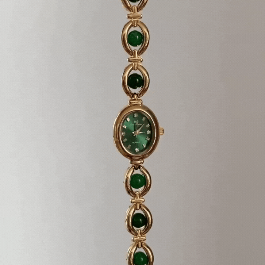 Montre à quartz pour femme avec bracelet en or et cadran doré incrustés de chrysoprase verte