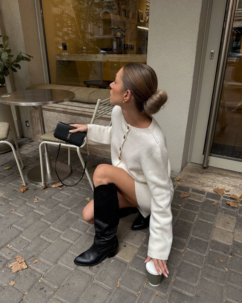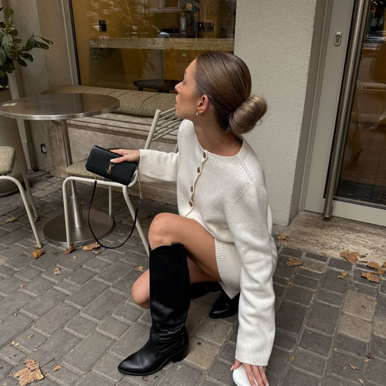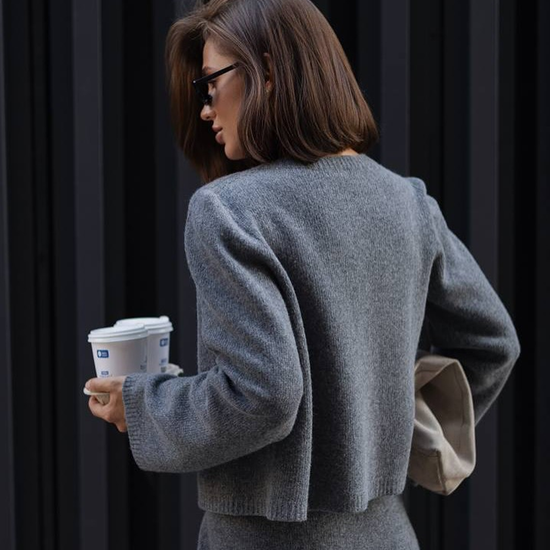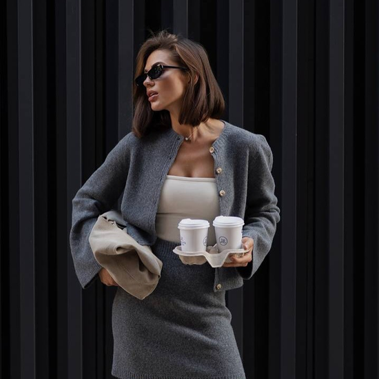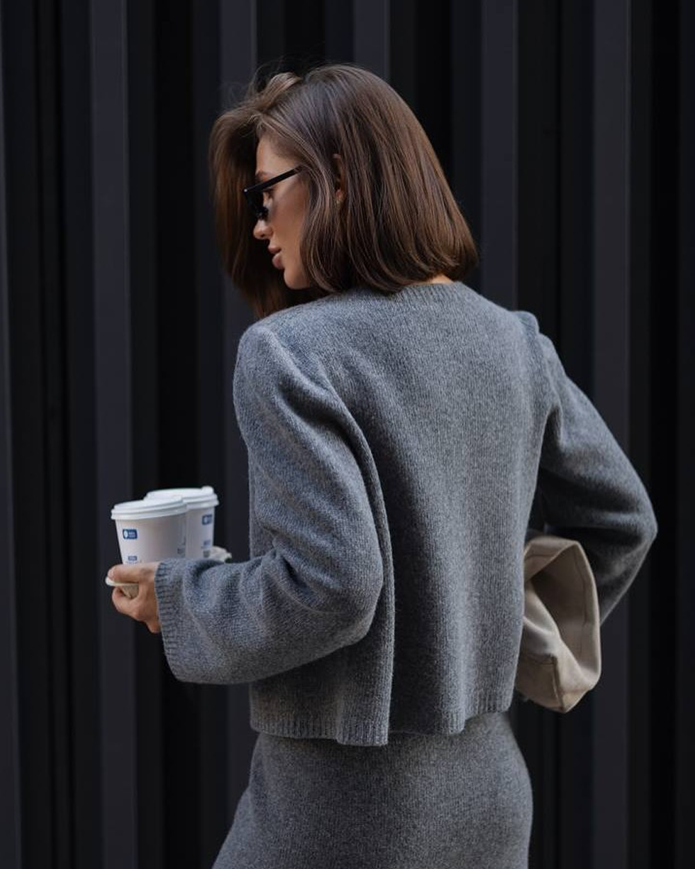 - Design Elements: Button-down cropped cardigan + matching mini skirt, ribbed edges, clean crew neckline