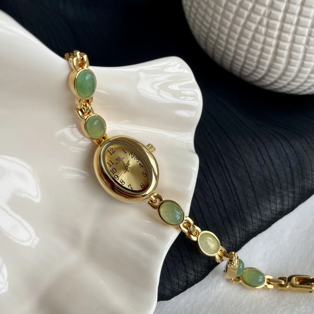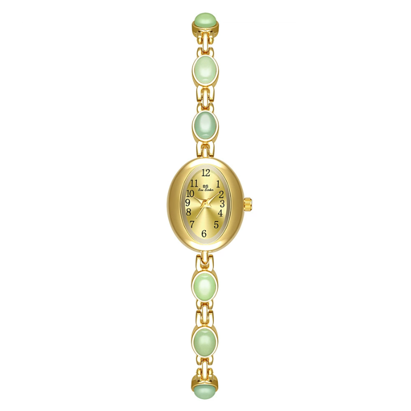 Cette montre à quartz pour femme arbore un élégant cadran ovale doré , monté sur un bracelet orné d'incrustations de jade naturel . La douce teinte verte du jade apporte une touche de raffinement apaisant, tandis que les tons dorés chaleureux et le cadran ovale évoquent une élégance vintage revisitée pour la femme moderne.