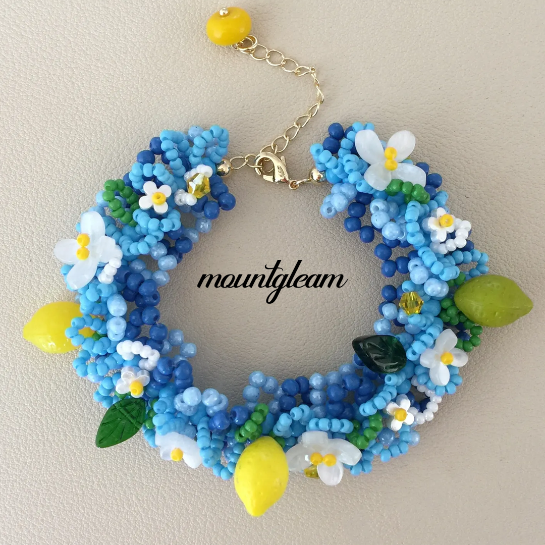 Lumineux, ludique et délicatement confectionné, le bracelet Lemon Bloom apporte une touche de charme rafraîchissante à votre poignet. Il est orné de perles de riz bleues de première qualité, de fleurs en verre détaillées, d'une breloque citron et feuille soufflée à la main et d'un fermoir mousqueton plaqué or 14 carats avec rallonge réglable. Une pièce légère et artisanale.