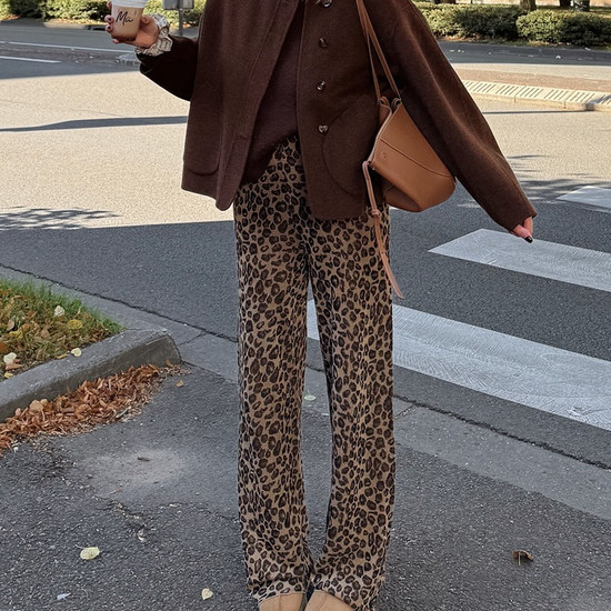- Design Elements: Leopard print, straight fit, soft corduroy texture