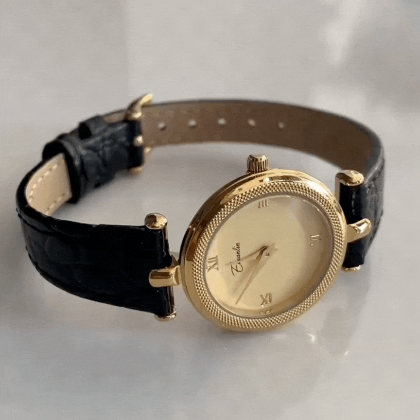 Découvrez la montre Midnight Regal, un mariage harmonieux de design classique et de sophistication moderne. Dotée d'un élégant cadran rond noir orné d'élégants chiffres romains dorés, et d'une palette raffinée de couleurs noir et or, cette montre dégage un charme intemporel et une polyvalence idéale en toute occasion.