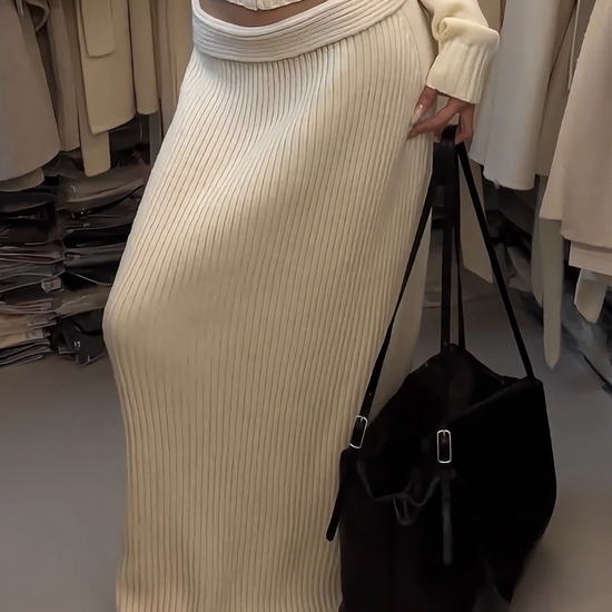 - Design Elements: Vertical rib knit, foldover waistband, long straight silhouette, stretch comfort