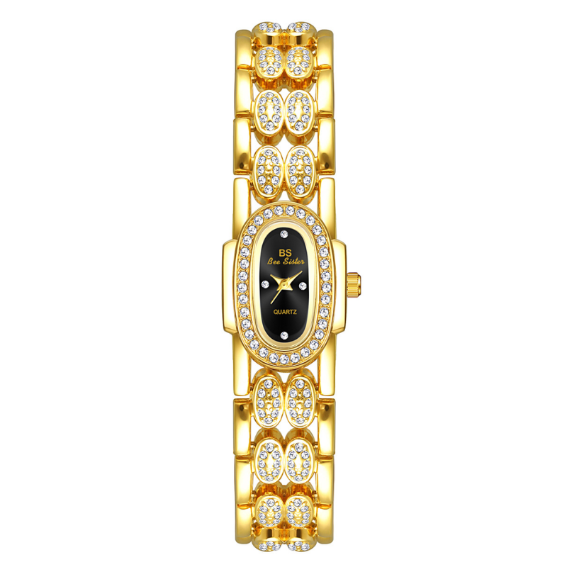 The Noir Éclat is a stunning fusion of jewelry and timekeeping. Designed with a vintage-inspired gold bangle bracelet, this women’s quartz watch features an elegant black mother-of-pearl oval dial that shimmers subtly under the light. Crystal accents add a touch of luxury, making it the perfect accessory for both evening elegance and daily sophistication.