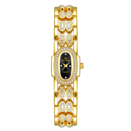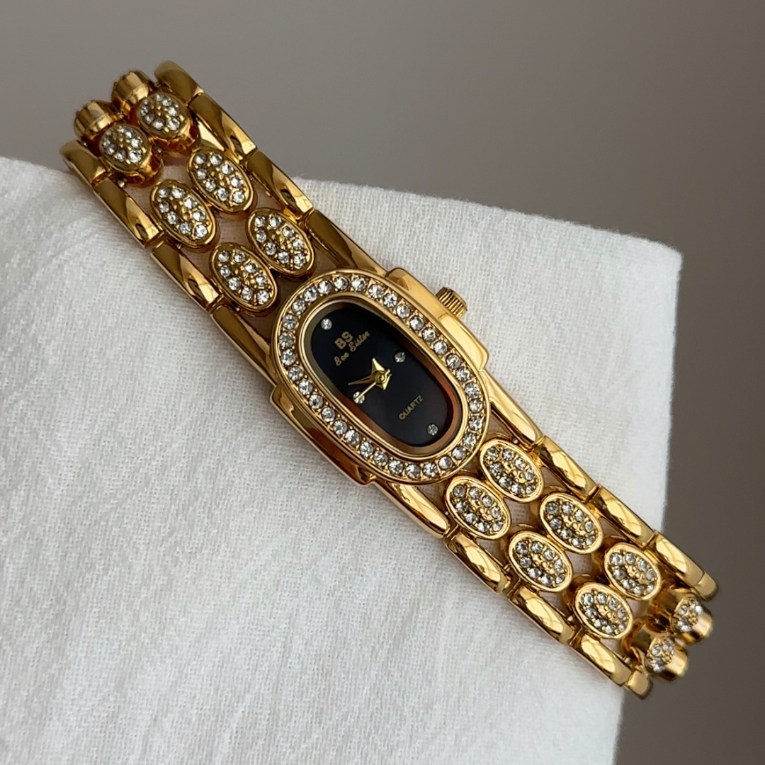 Noir Éclat – Vintage Gold Bangle Women’s Quartz Watch with Black Mother-of-Pearl Oval Dial and Crystal Detailing