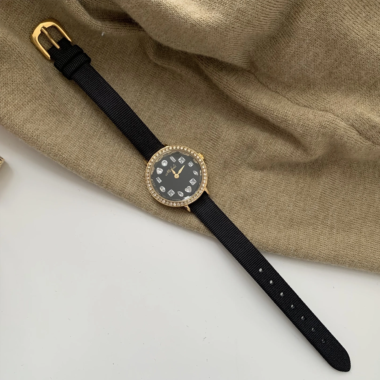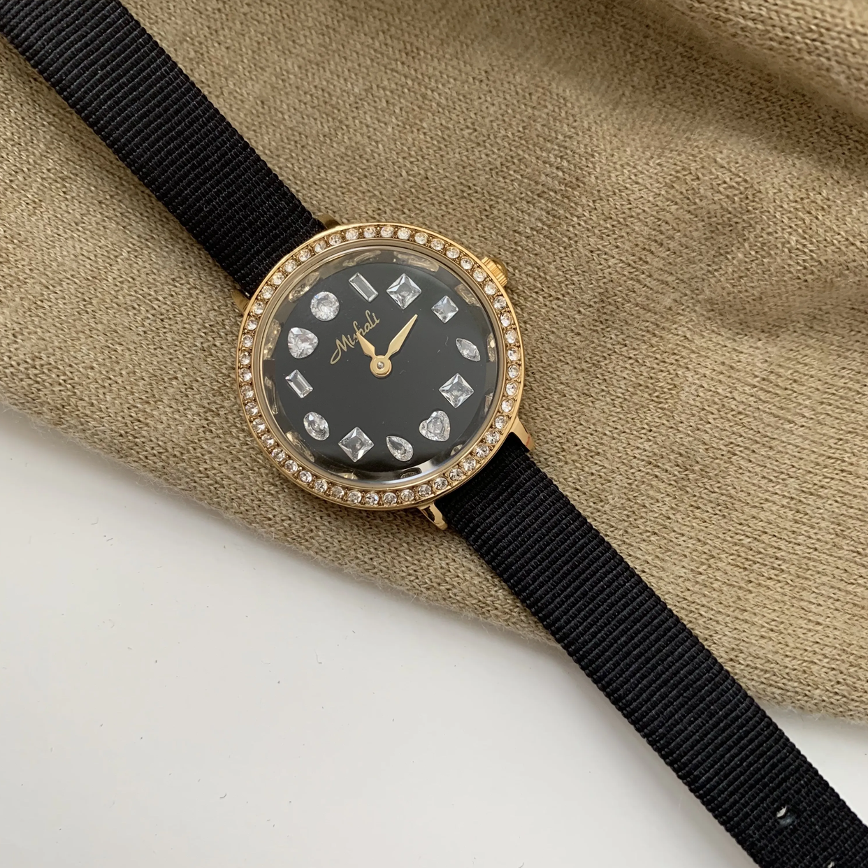 Découvrez la montre Radiant Noir, symbole d'élégance raffinée et de luxe contemporain. Dotée d'un bracelet doré saisissant, rehaussé de diamants noirs brillants, et d'un cadran rond épuré et minimaliste, cette montre incarne une sophistication intemporelle avec une touche de modernité. Son design sobre et son savoir-faire méticuleux en font l'accessoire idéal en toute occasion, ajoutant une touche d'élégance à votre tenue.