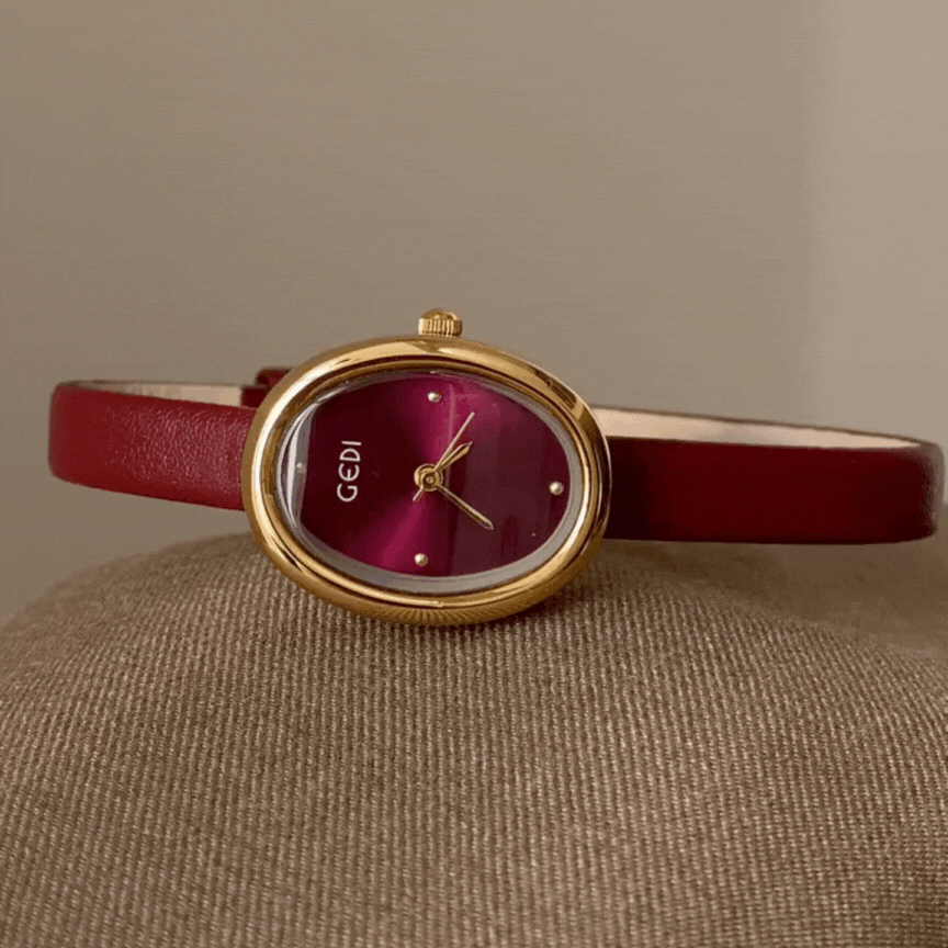 Red Women Oval Dial Watch Genuine Leather Slim Strap Gold Case Quartz French Vintage – Amour