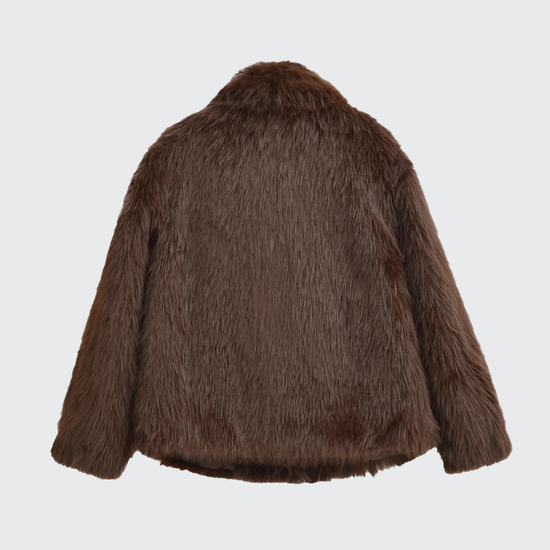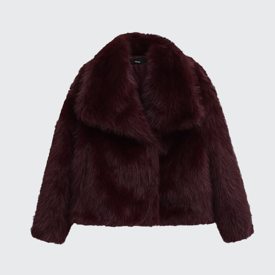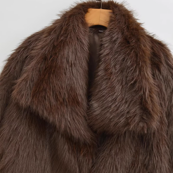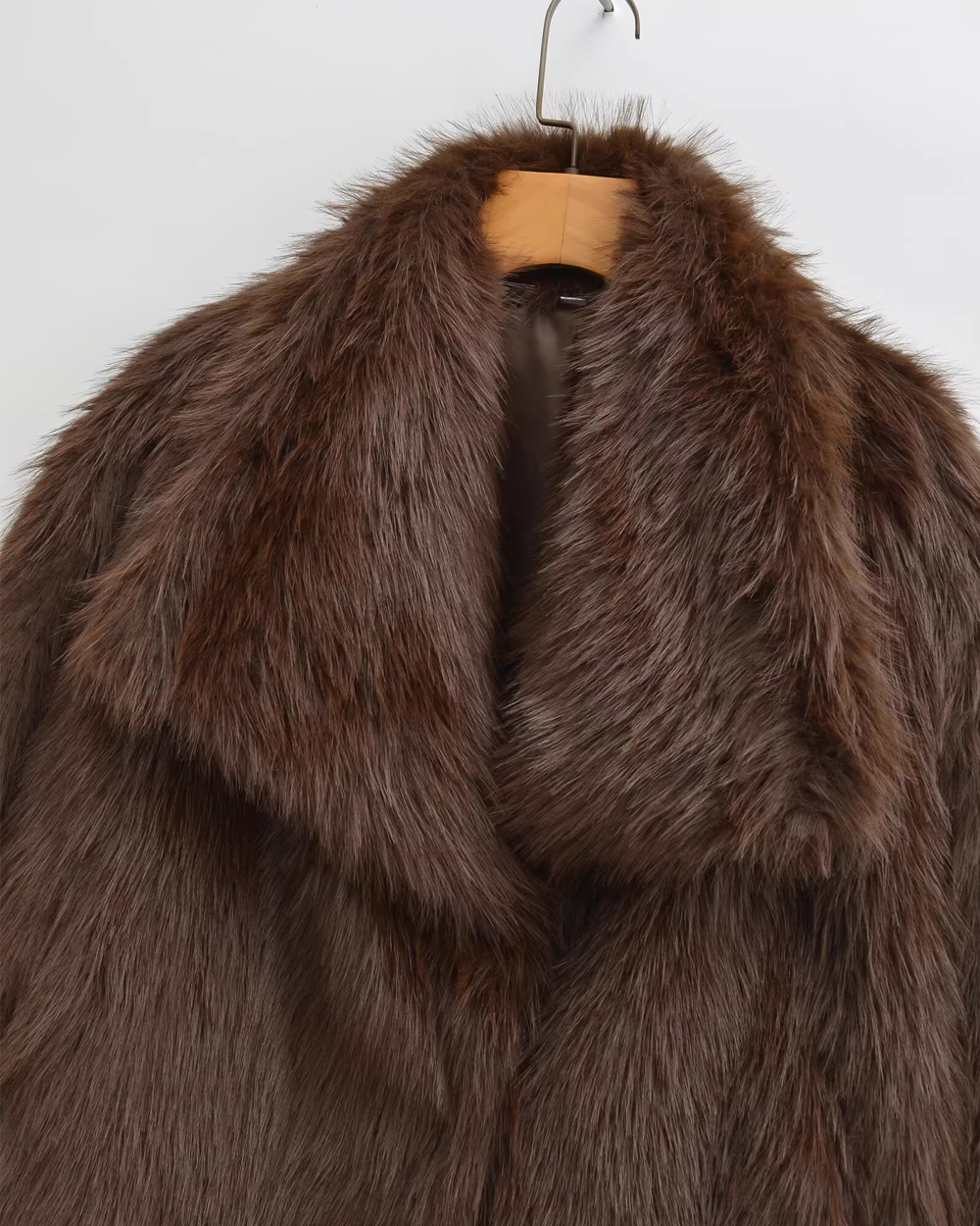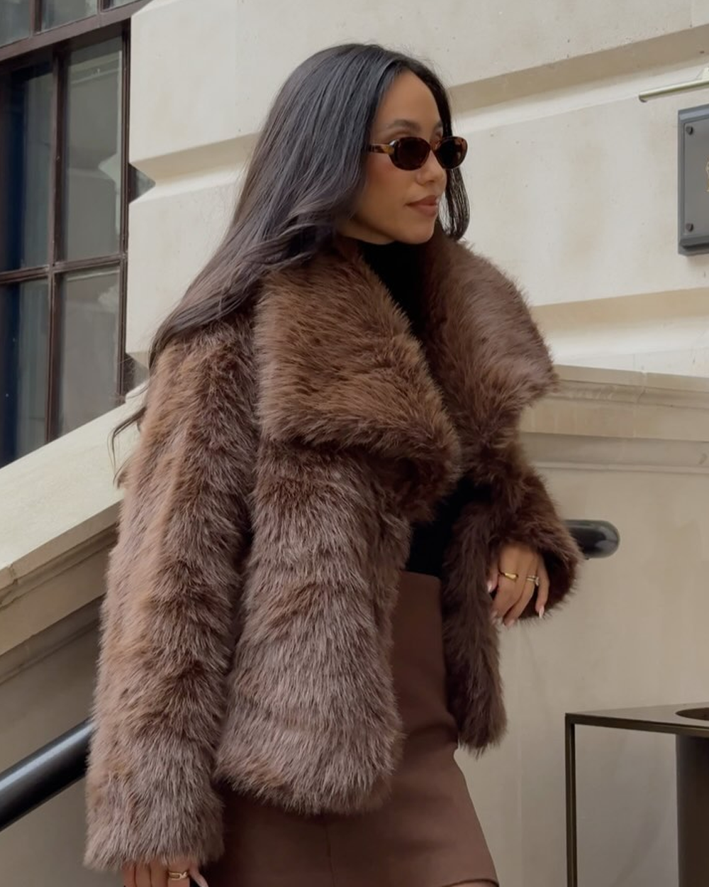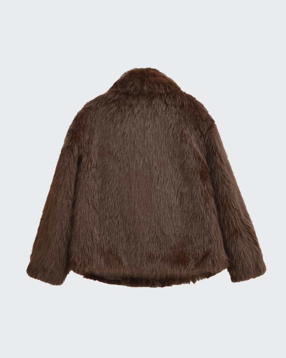 - Design Elements: Soft faux fur texture, oversized collar, minimalist silhouette, hook closure front