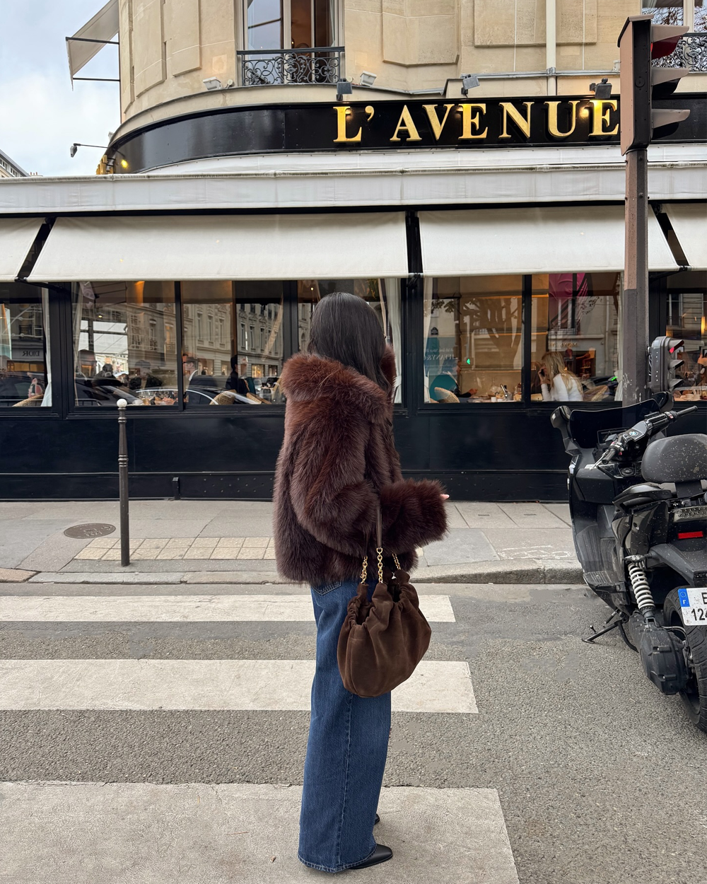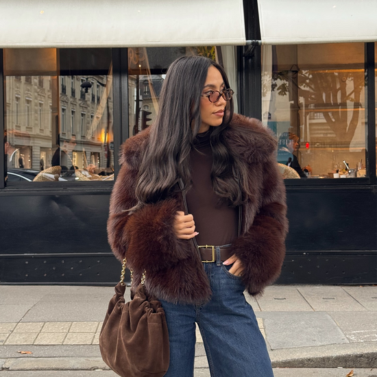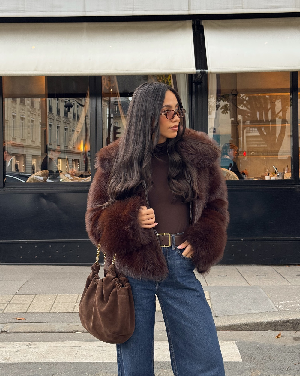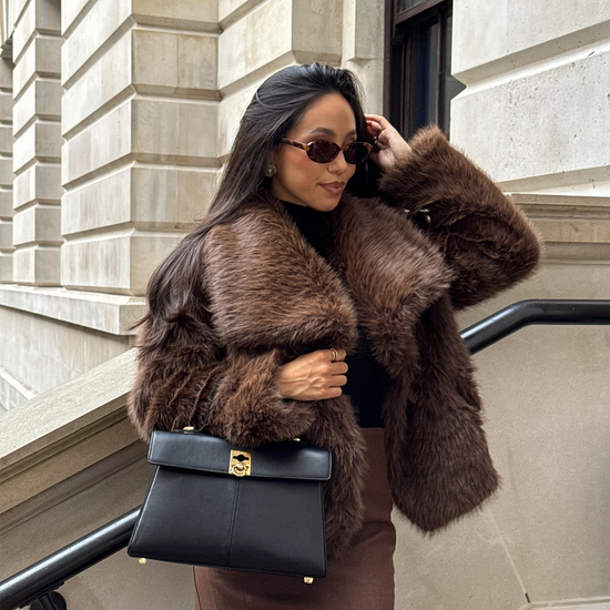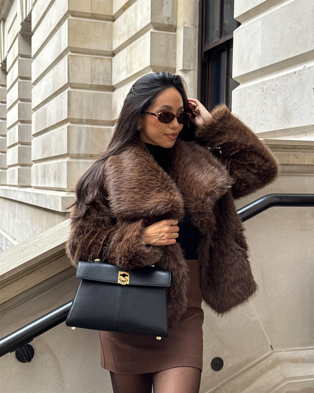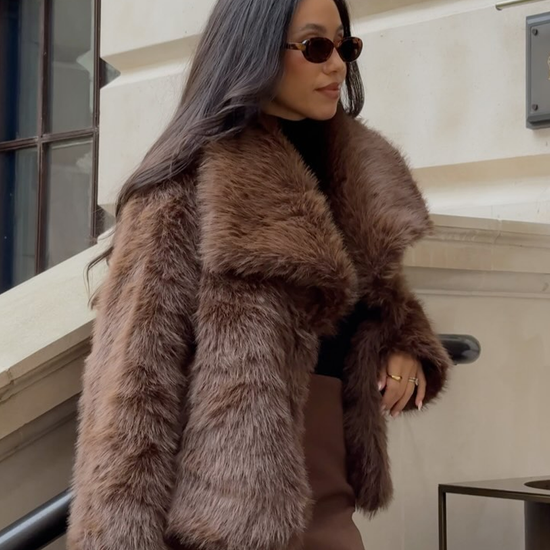 - Design Elements: Soft faux fur texture, oversized collar, minimalist silhouette, hook closure front