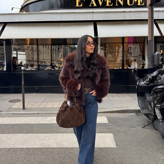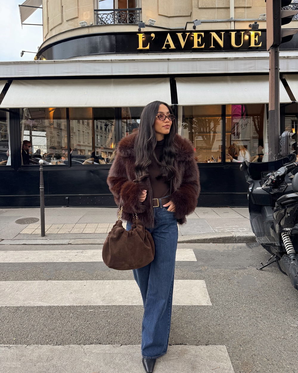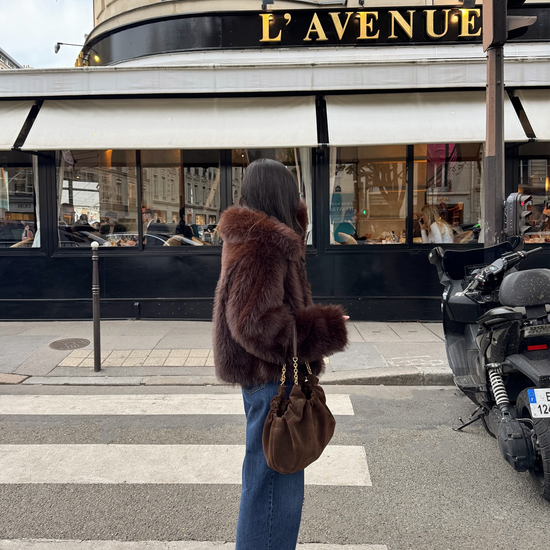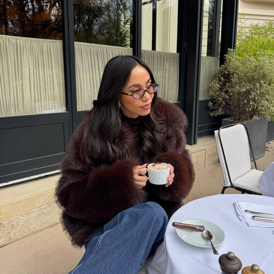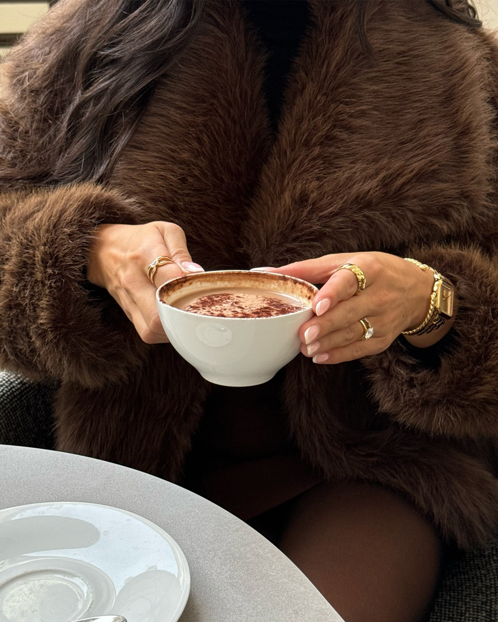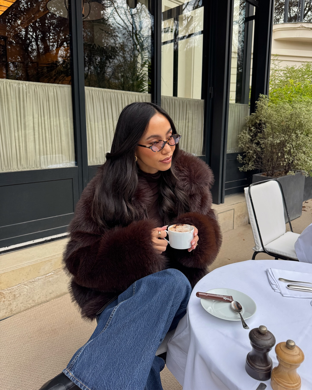 - Design Elements: Soft faux fur texture, oversized collar, minimalist silhouette, hook closure front