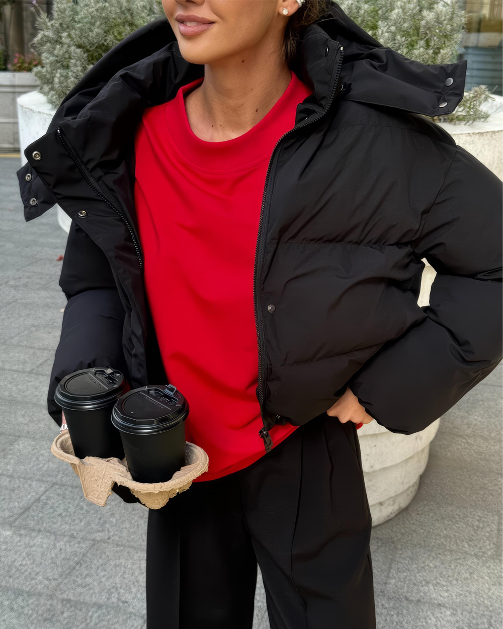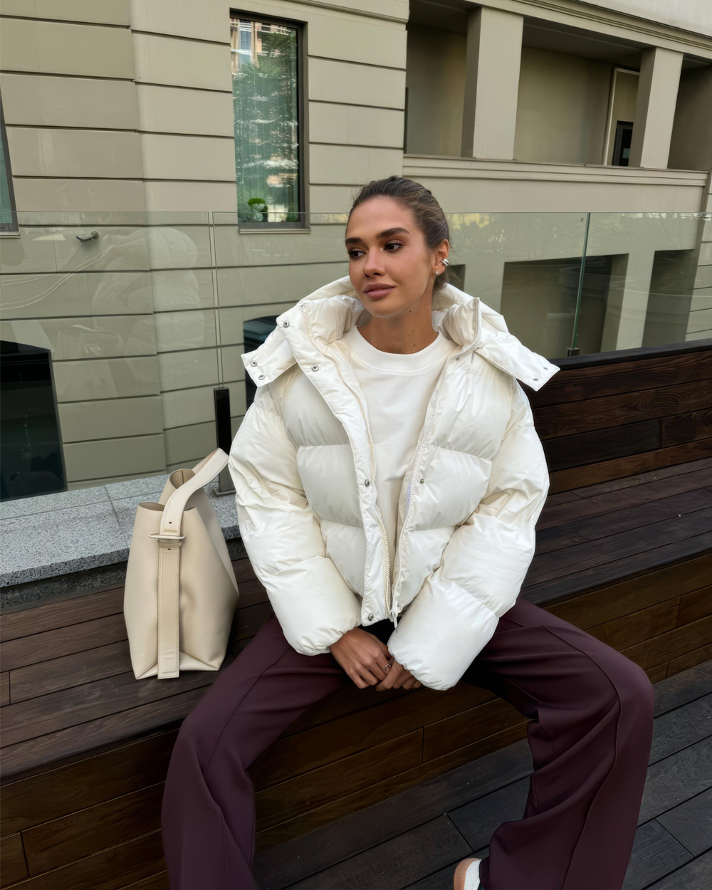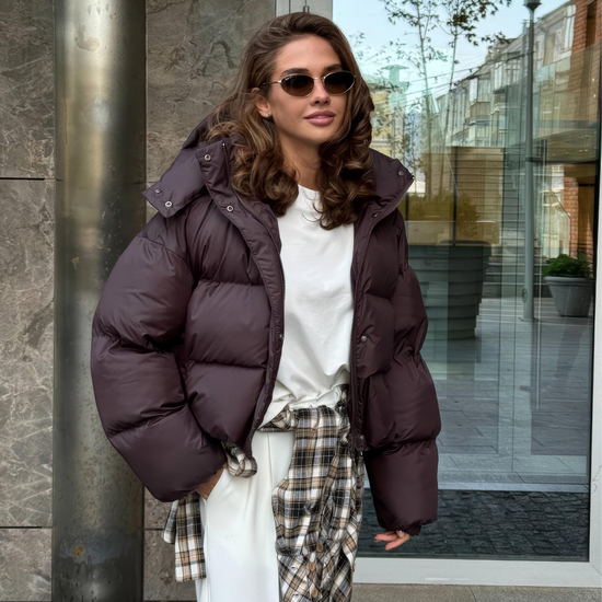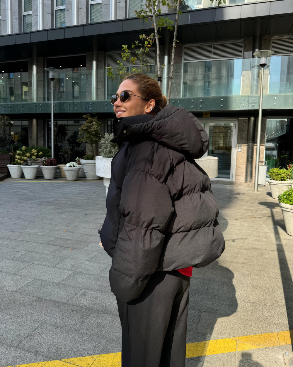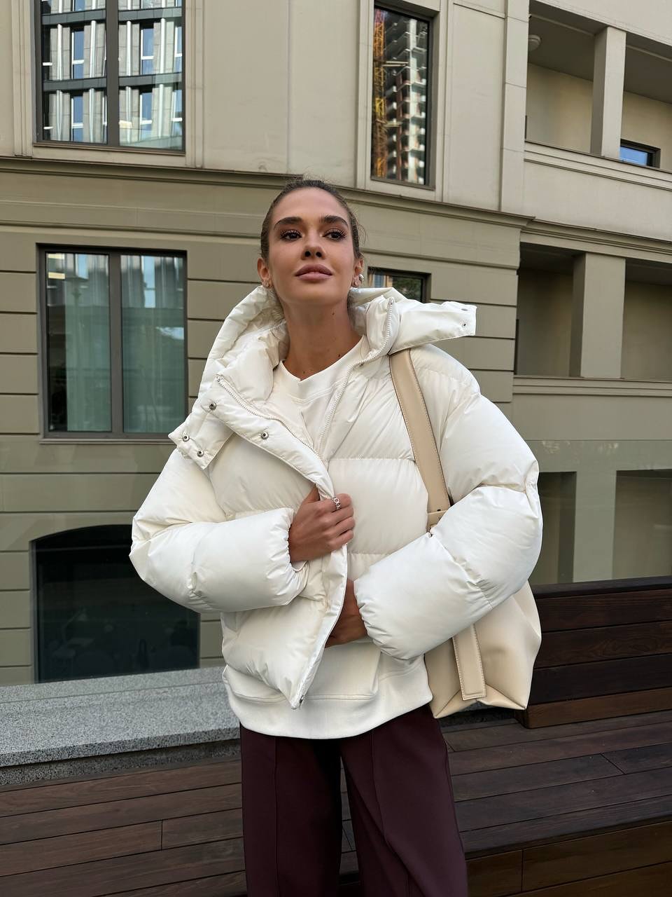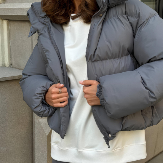 - Design Elements: Glossy finish, stand collar, oversized padding, zip & snap front, adjustable hem
