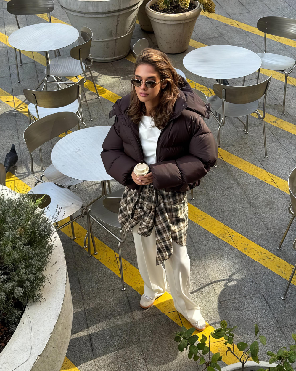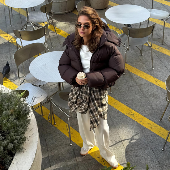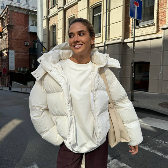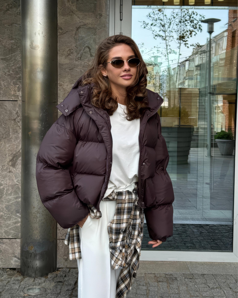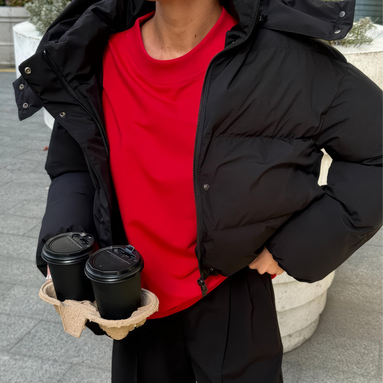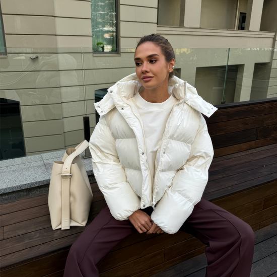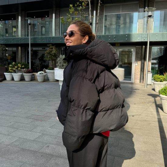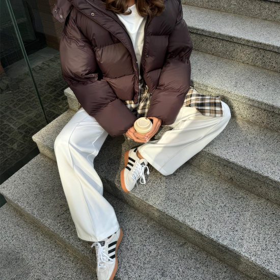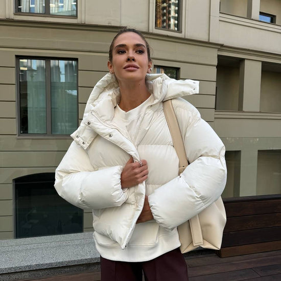 - Design Elements: Glossy finish, stand collar, oversized padding, zip & snap front, adjustable hem