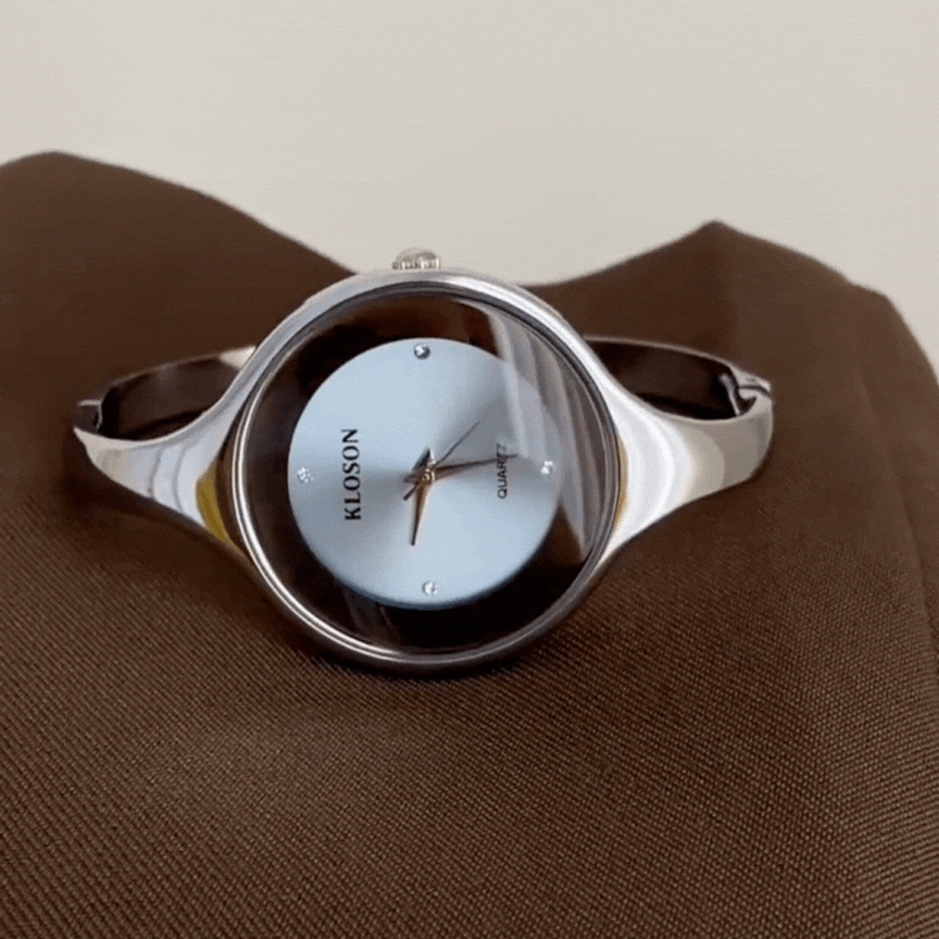 Montre à quartz avec bracelet manchette argenté pour femme – Grand cadran rond bleu, élégante et moderne