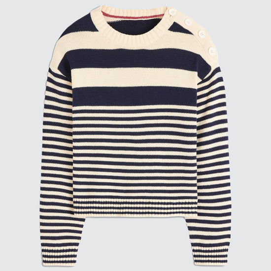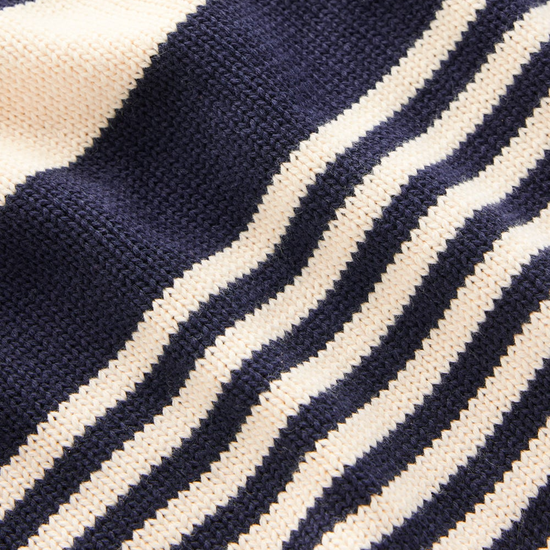 - Design Elements: Horizontal navy stripes, shoulder button detail, ribbed cuffs