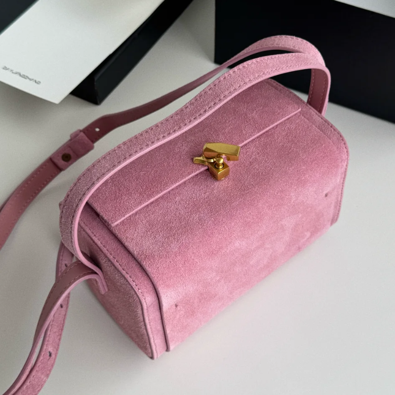 Add a touch of understated luxury to your style with this Mini Boston Bag in Sunset Pink Suede Leather. Crafted from second-layer cowhide with a velvety suede texture, it perfectly blends elegance and softness. The gentle pink hue reflects the glow of a sunset — warm, calm, and effortlessly chic.