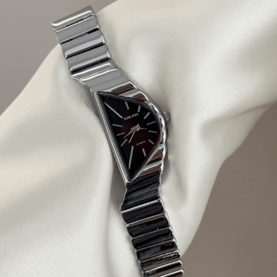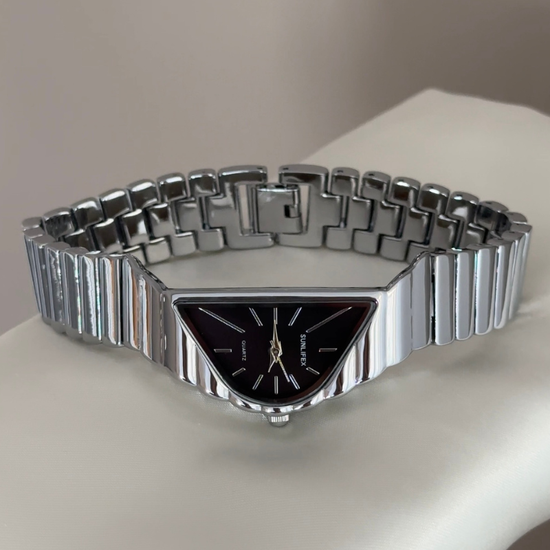 Crafted for urban individuals valuing clean lines and versatile style, this watch features a bold black crescent dial framed by a polished silver-tone bezel, complemented by a matching silver alloy bracelet. Reliable quartz movement ensures precise timekeeping. Lightweight, scratch-resistant, and water-resistant, it transitions effortlessly from office to evening—serving as both a functional timepiece and a modern style accent, ideal as a thoughtful design-conscious gift or a personal staple celebrating geometric elegance and urban versatility.