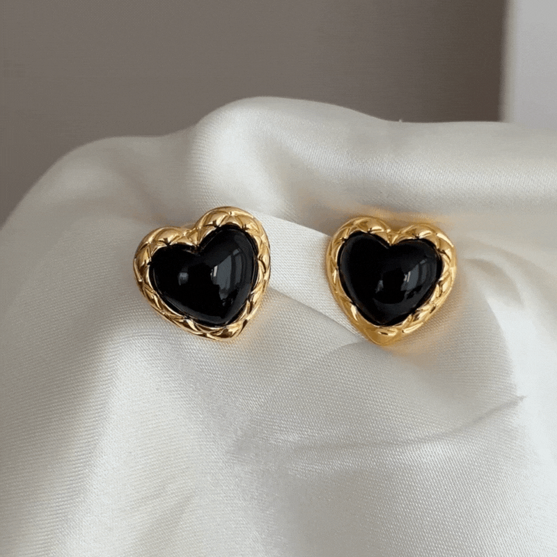 Embrace a touch of timeless romance and dark elegance with these Vintage Black Gold Heart Earrings. Masterfully crafted to balance classic symbolism with a bold, sophisticated edge, these ear studs are designed for the woman who expresses her style with depth, passion, and a hint of mystery. The design centers on a captivating black onyx heart, a stone revered for its grounding energy and sleek beauty, set within an intricately detailed black gold-tone frame that exudes vintage allure.