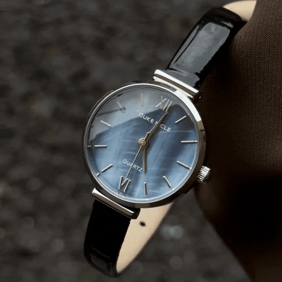 Featuring an iridescent blue mother-of-pearl dial that shifts with light, this watch is framed by a polished silver bezel and paired with a supple black leather strap. Powered by reliable quartz, it is lightweight and versatile for daily wear. A timeless accessory of natural elegance—ideal as a cherished gift or personal indulgence.