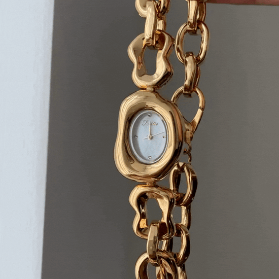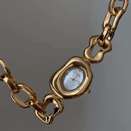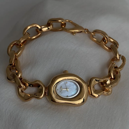 Ovaj ženski kvarcni sat ima svjetleći bijeli sedefasti brojčanik, uokviren od strane apstraktna narukvica s oblikovanim lancem koji teče poput modernog nakita. Fluidan, asimetričan dizajn nudi mekan dojam - graciozan, minimalan i tiho prepoznatljiv.
