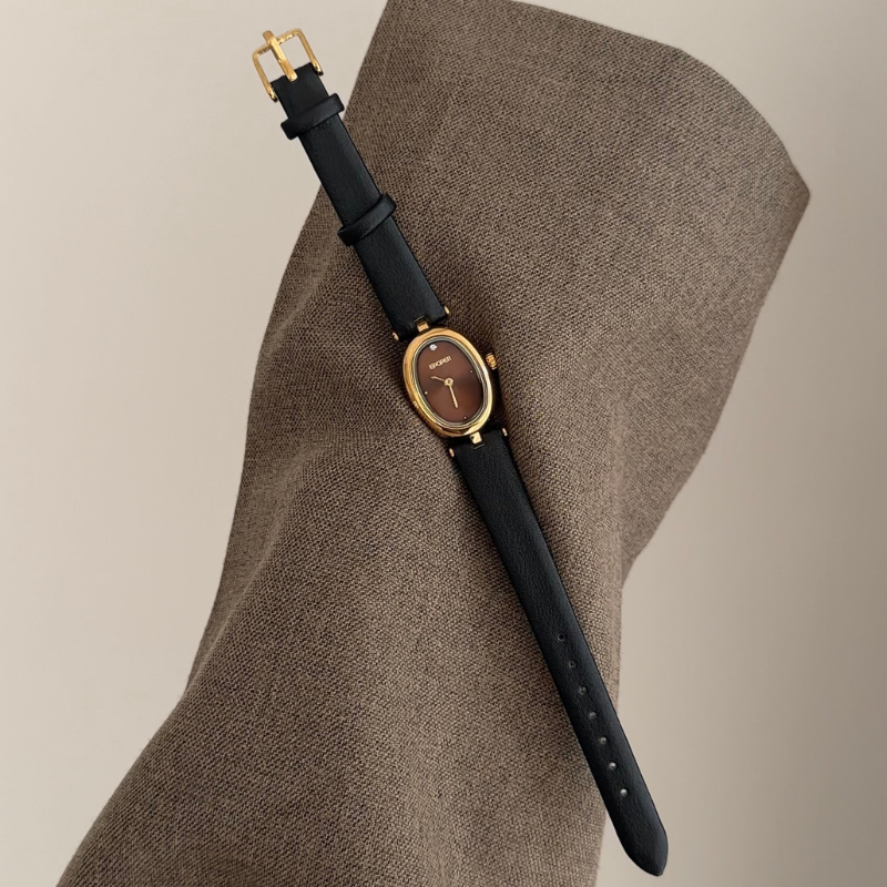 Classic Fashion Black Slim Leather Strap Oval Case Brown Dial Ladies Quartz Watch