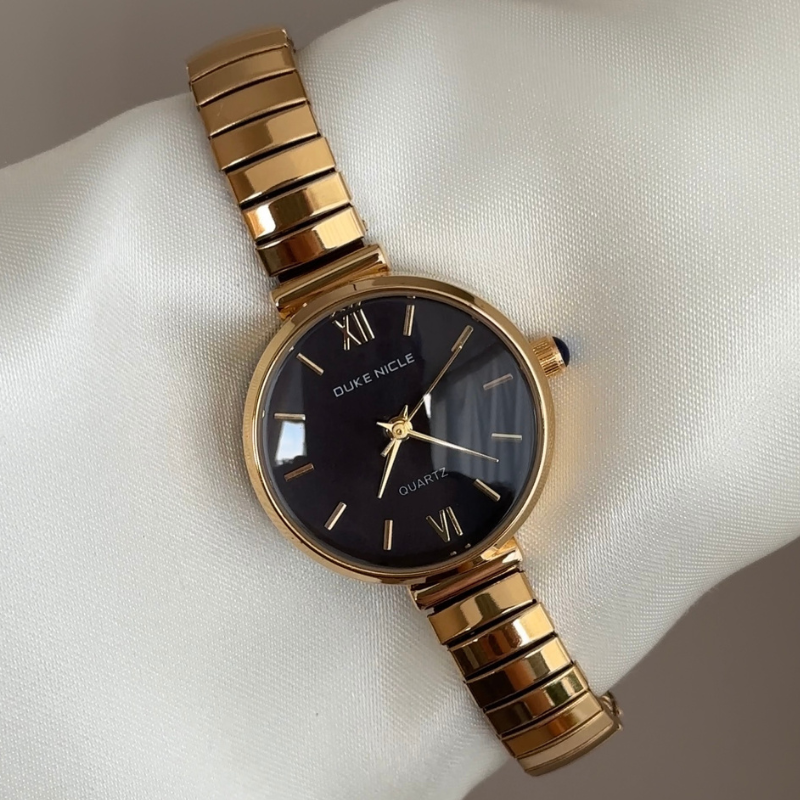 Designed for effortless everyday style, this watch features a classic black round dial with a polished gold-tone bezel and a flexible gold-tone alloy stretch band for comfortable, adjustable wear. Powered by reliable quartz movement, it ensures accurate timekeeping and is lightweight, durable, and water-resistant for daily use. A versatile accessory ideal for work, casual outings, or as a thoughtful gift, it blends clean aesthetics with practical versatility in a timeless design.