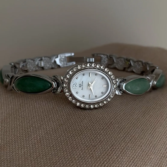 Ovaj elegantni kvarcni sat ima nježni ovalni brojčanik od sedefa, uokviren s svjetlucavi kristali i postavljen u dizajn narukvice s intarzijom od zelenog žadaKombinirajući prirodnu ljepotu s profinjenim detaljima, to je graciozan komad koji zrači tihim luksuzom.